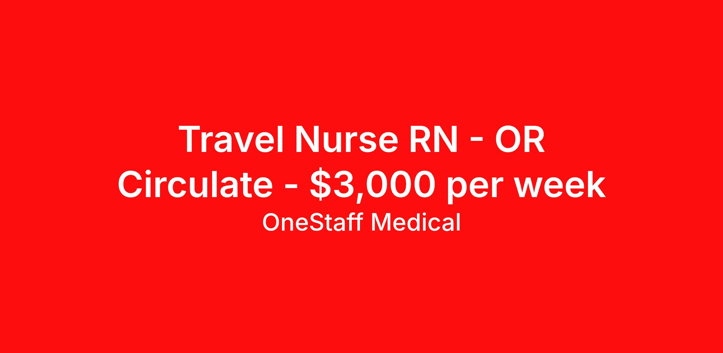 OneStaff Medical is seeking a travel nurse RN OR Circulate for a travel nursing job in Chesterfield, Missouri. Job Description & Requirements Specialty: OR Circulate Discipline: RN Start Date: 04/06/2026 Duration: 8 weeks 40 hours per week Shift: 8 hours, days Employment Type: Travel About OneStaff Medical You deserve a partner that is working for you. Be bold and let us do just that. We’ll take care of you while you are away from your own “home base” in every way we can, and ideally do more than you expect. Your team at OneStaff is dedicated to finding the perfect assignments (for you), negotiate the best rates and handles any issues that may arise while you are on assignment. We take great pride in building relationships with our traveling professionals and we enjoy hearing about your experiences. Whatever the need, we are here to help along the journey. We understand you are the heart and soul of what we are. Whether it is housing, payroll, travel, benefits, or just a friendly voice to talk to, we are there every step of the way. The company you choose is the most important decision you will make in your traveling career. We get that, so we’re committed to you 24 hours-a-day, 7 days-a-week. We’re your “one” solution in travel assignments and here to assist whether helping with accelerating your trajectory towards your career goals or meeting your travel requirements. Benefits Weekly pay Holiday Pay Guaranteed Hours 401k retirement plan Pet insurance Company provided housing options Sick pay Wellness and fitness programs Referral bonus Medical benefits Dental benefits Vision benefits