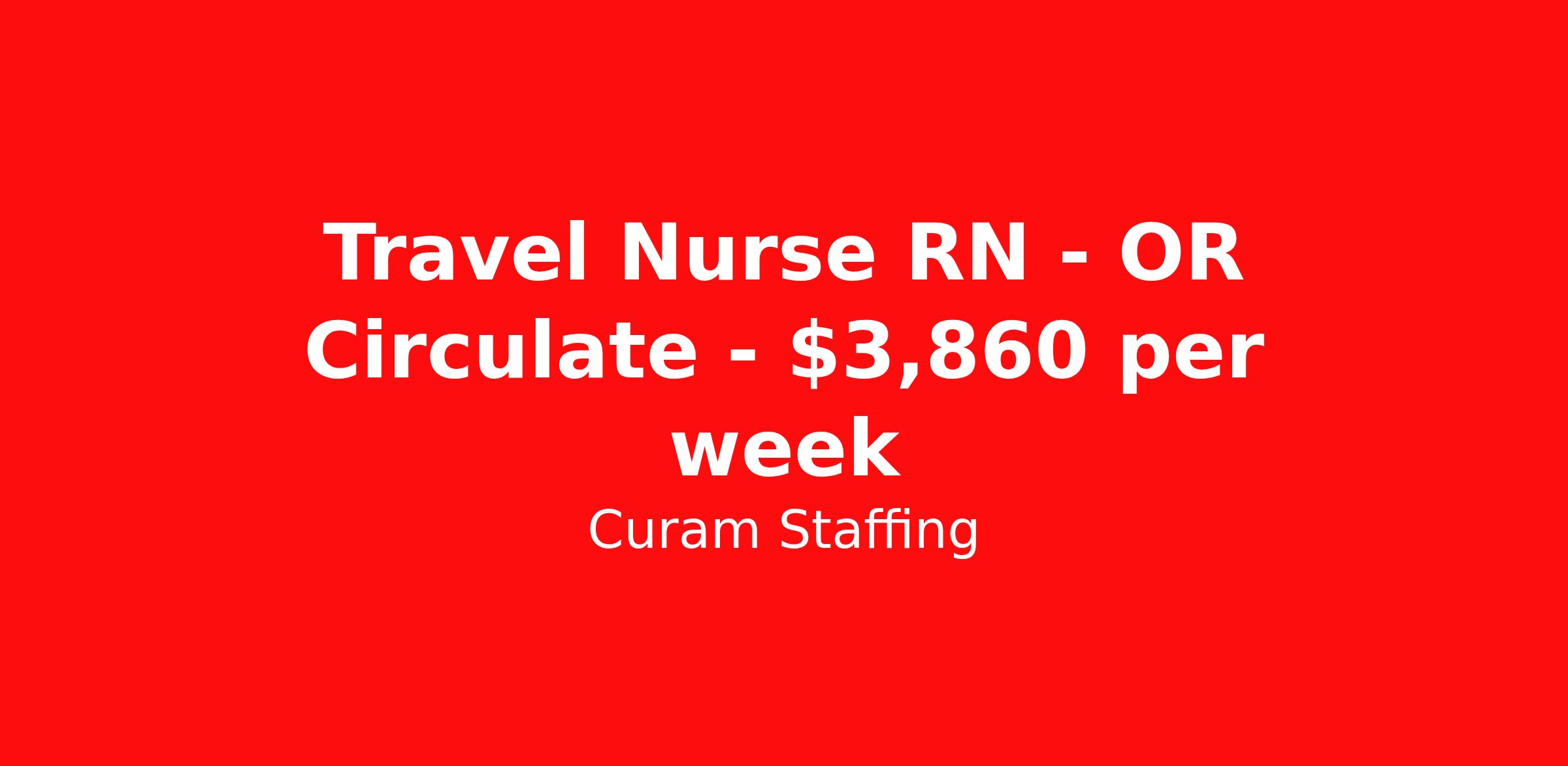 Curam Staffing is seeking a travel nurse RN OR Circulate for a travel nursing job in Rochester, New York. Job Description & Requirements Specialty: OR Circulate Discipline: RN Start Date: 04/13/2026 Duration: 13 weeks 48 hours per week Shift: 12 hours, days Employment Type: Travel Curam Staffing Job ID 3172026-796998. Pay package is based on 12 hour shifts and 48 hours per week (subject to confirmation) with tax-free stipend amount to be determined. About Curam Staffing Curam Staffing was started to help candidates find good, viable jobs. Our goal is to partner with hospitals and streamline the interviewing process to reduce the amount of times you need to be submitted to a position. Benefits License and certification reimbursement Weekly pay Continuing Education
