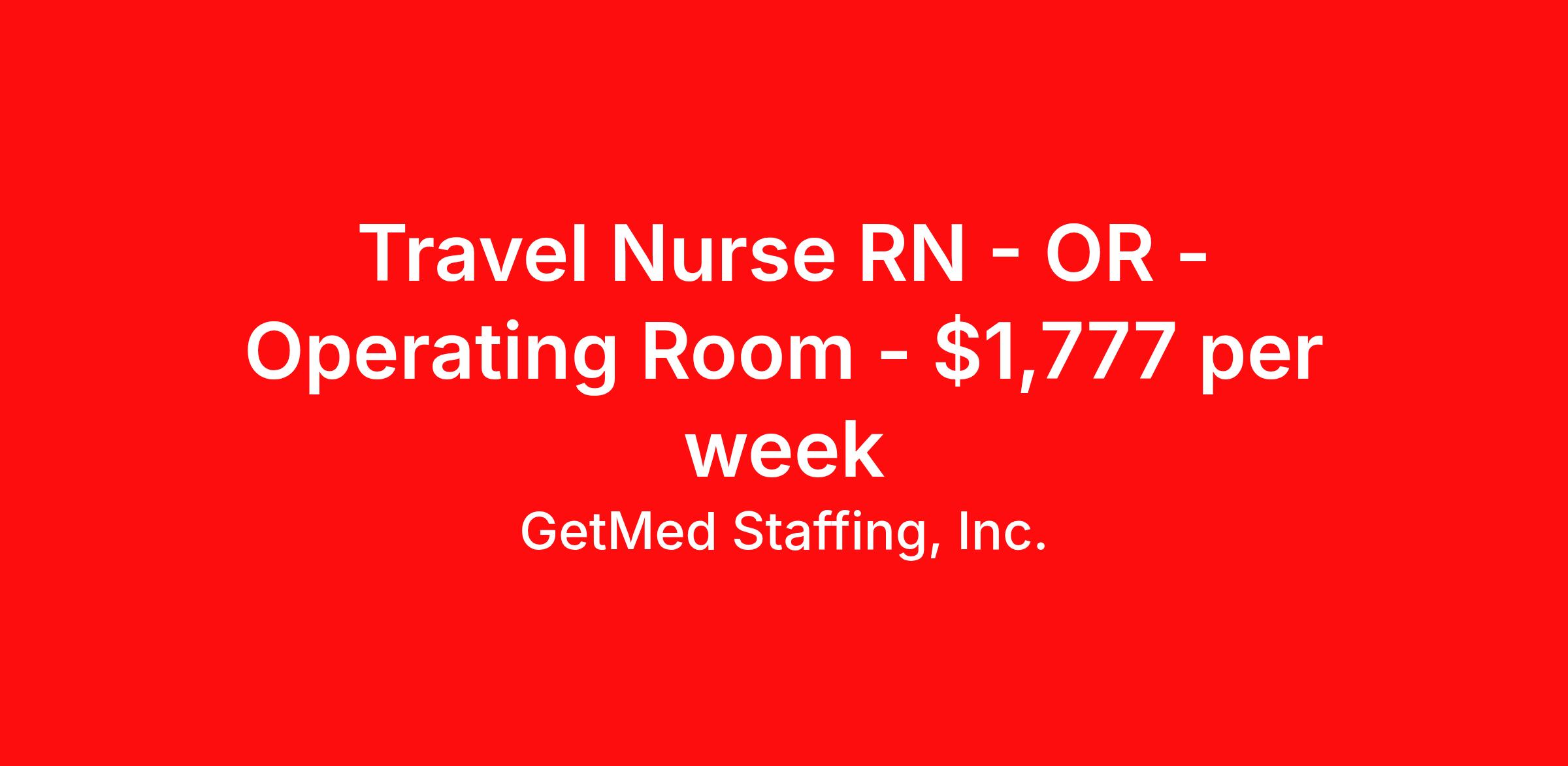 GetMed Staffing, Inc. is seeking a travel nurse RN OR - Operating Room for a travel nursing job in Austell, Georgia. Job Description & Requirements Specialty: OR - Operating Room Discipline: RN Start Date: 03/30/2026 Duration: 13 weeks 40 hours per week Shift: 8 hours, days Employment Type: Travel GetMed Staffing is searching for a strong OR RN to assist our traveler-friendly client. A minimum of 1-2 years of experience is required. Traveling with GetMed Staffing offers the unique opportunity to gain diverse experiences, both personally and professionally. Gain experience that matters. GetMed Staffing, Inc. Job ID 35809498. Pay package is based on 8 hour shifts and 40.0 hours per week (subject to confirmation) with tax-free stipend amount to be determined. Posted job title: RN:OR,07:00:00-15:00:00 About GetMed Staffing, Inc. We are a diversity owned company, specializing in healthcare recruiting services. We truly understand how important a healthcare travelers' relationship is with their recruiter, as well as our relationship is with our healthcare facilities. We recognize that the needs of our healthcare travelers can vary, and therefore we provide the personalized touch necessary to ensure a successful travel assignment each and every time. Our healthcare facilities and clients benefit from us putting our healthcare travelers first. GetMed Staffing is excited to be a leader within the industry by focusing on providing healthcare travelers with more choices and possibilities as they plan for their next healthcare travel assignment. Benefits Life insurance Medical benefits Dental benefits Vision benefits 401k retirement plan