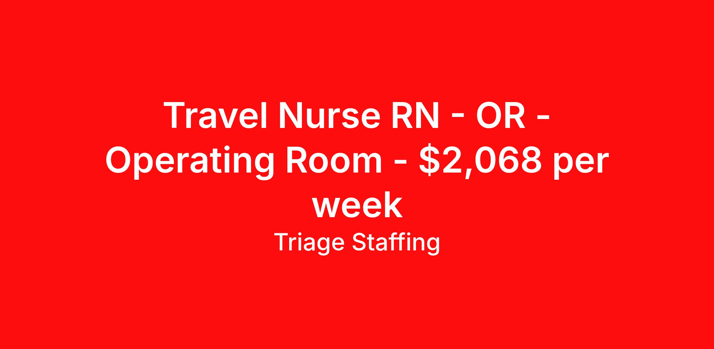 Triage Staffing is seeking a travel nurse RN OR - Operating Room for a travel nursing job in Manchester, Kentucky. Job Description & Requirements Specialty: OR - Operating Room Discipline: RN Start Date: 04/06/2026 Duration: 13 weeks 40 hours per week Shift: 8 hours, days Employment Type: Travel Travel Nursing: OR Manchester Location: Manchester Start Date: 4/6/2026 Shift Details: 8H Days 40 hours per week Length: 13 WEEKS Apply for specific facility details.OR RN Triage Staffing Job ID YTD9RNGX. Posted job title: Registered Nurse Operating Room About Triage Staffing At Triage, we prefer to be real . Real about expectations—both ours and yours. Real about how a decision you make today could affect your tomorrows. Real about how compensation actually works. Real about how great—or grating—your next supervisor may be. Being real allows everyone at Triage to be ready . Ready to serve you with real honesty. So if that gig near the ocean is really no day at the beach, or that third shift comes with a second-class rate, we tell you. So you can be ready, too. We staff all five major divisions of acute care—nursing, lab, radiology, cardiopulmonary and rehab therapy, offering: - Competitive, custom pay packages - One point of contact for both travelers and facilities (per division) - A reliable recruiter who's got your back throughout your entire assignment - In-house compliance and accounting specialists - A clinical liaison team available 24/7 to offer medical and professional support and career development - A mentoring program that is run and managed by actual clinicians—yeah, you read that right - And more (because of course there’s more) Are we the biggest? No. Are we the best? That’s rather subjective, but we’re trying to be. Will we work like hell to get you as close to your idea of heaven as possible? Yes. Yes, we will. Benefits: Day One comprehensive, nationwide insurance plans for health, vision and dental and life—including a HSA option Day One 401(k) program with employer-matching contributions once eligible Facility cancelling protection—your time is money on and off-the-clock Guaranteed hours Weekly paychecks via direct deposit Earned vacation bonuses for time worked Paid holidays Employee assistance program (EAP)—your mental health is important, too Continuing education, certification and licensing reimbursement Workers comp—because accidents happen Top-rated professional liability insurance Company provided housing options Referral bonus—$750 in your pocket after they’ve completed a 13-week assignment