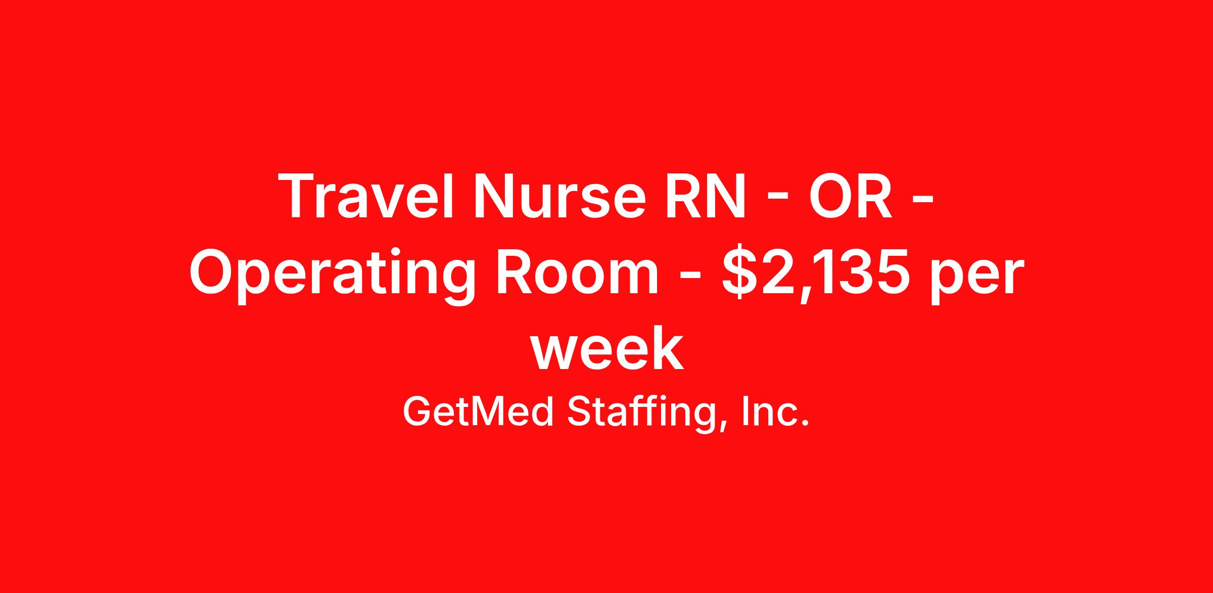 GetMed Staffing, Inc. is seeking a travel nurse RN OR - Operating Room for a travel nursing job in Rapid City, South Dakota. Job Description & Requirements Specialty: OR - Operating Room Discipline: RN Start Date: 04/20/2026 Duration: 13 weeks 36 hours per week Shift: 12 hours, nights Employment Type: Travel GetMed Staffing, Inc. Job ID 35985095. Pay package is based on 12 hour shifts and 36.0 hours per week (subject to confirmation) with tax-free stipend amount to be determined. Posted job title: RN:OR,19:00:00-07:00:00 About GetMed Staffing, Inc. We are a diversity owned company, specializing in healthcare recruiting services. We truly understand how important a healthcare travelers' relationship is with their recruiter, as well as our relationship is with our healthcare facilities. We recognize that the needs of our healthcare travelers can vary, and therefore we provide the personalized touch necessary to ensure a successful travel assignment each and every time. Our healthcare facilities and clients benefit from us putting our healthcare travelers first. GetMed Staffing is excited to be a leader within the industry by focusing on providing healthcare travelers with more choices and possibilities as they plan for their next healthcare travel assignment. Benefits Life insurance Medical benefits Dental benefits Vision benefits 401k retirement plan