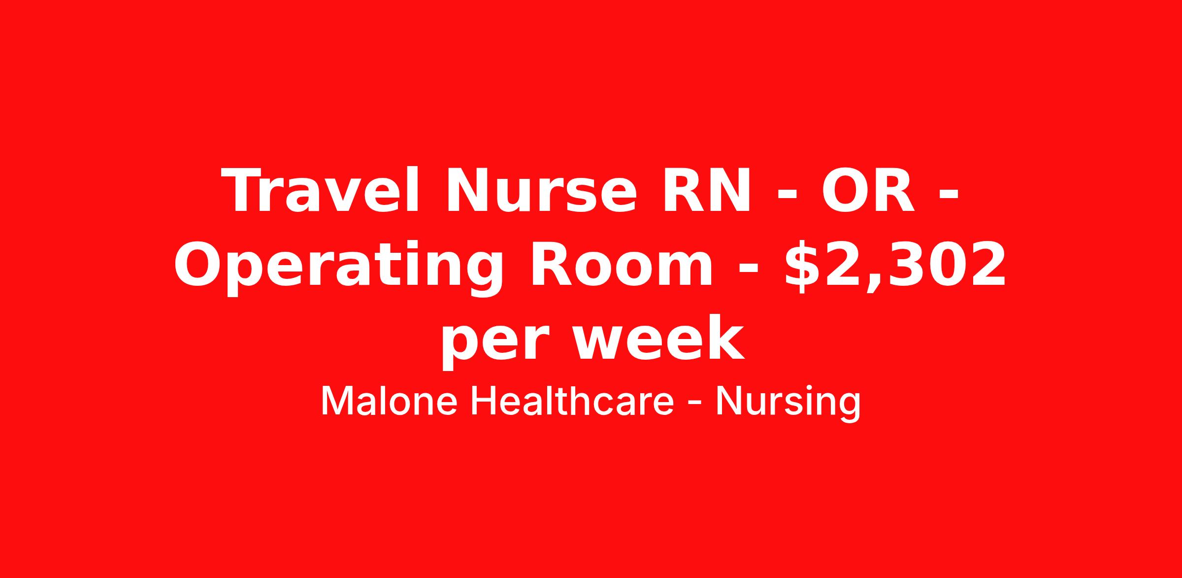 Malone Healthcare - Nursing is seeking a travel nurse RN OR - Operating Room for a travel nursing job in Madison, Indiana. Job Description & Requirements Specialty: OR - Operating Room Discipline: RN Start Date: 03/22/2026 Duration: 13 weeks 40 hours per week Shift: 8 hours, days Employment Type: Travel Comments Shift: 630a-3p with call Required: BLS, ACLS, 2 years experience, experience with ortho, general, OB/GYN, eyes, spine About Malone Healthcare - Nursing With a commitment to providing a higher standard of service and experience in patient care, Malone Healthcare places expert nurses and allied health professionals in rewarding careers throughout the United States. As a leading healthcare staffing agency, Malone’s focus on compliance and integrity translates to a seamless experience for our team members and partner facilities. When you work with Malone Healthcare, you can rely on over 50 years of proven experience placing exceptional professionals in quality healthcare settings. Benefits Weekly pay Holiday Pay Guaranteed Hours Continuing Education 401k retirement plan Pet insurance Referral bonus Medical benefits Dental benefits Vision benefits License and certification reimbursement Life insurance