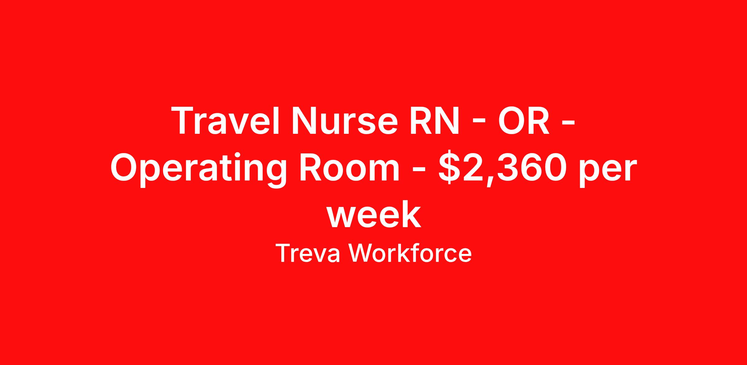 Treva Workforce is seeking a travel nurse RN OR - Operating Room for a travel nursing job in Austin, Texas. Job Description & Requirements Specialty: OR - Operating Room Discipline: RN Duration: 13 weeks 40 hours per week Shift: 8 hours, nights Employment Type: Travel Treva Workforce Job ID ASC-42701. Pay package is based on 8 hour shifts and 40 hours per week (subject to confirmation) with tax-free stipend amount to be determined. About Treva Workforce Treva Workforce is a woman-owned healthcare staffing agency connecting healthcare professionals to nationwide opportunities. We stand out by offering 24/7 support, quick communication, and a team that truly listens. Recognized as a Michigan Top Workplaces organization and a Better Business Bureau Torch Awards for Ethics Finalist, we’re committed to doing things the right way. Treva Workforce provides comprehensive medical, dental, and vision coverage, a 401(k) retirement, life insurance, pet insurance, and dedicated recruiters who focus on finding roles that align with your goals, lifestyle, and career growth. From your first assignment to your last, Treva Workforce will support you every step of the way. Benefits Vision benefits Weekly pay 401k retirement plan Referral bonus Medical benefits Dental benefits