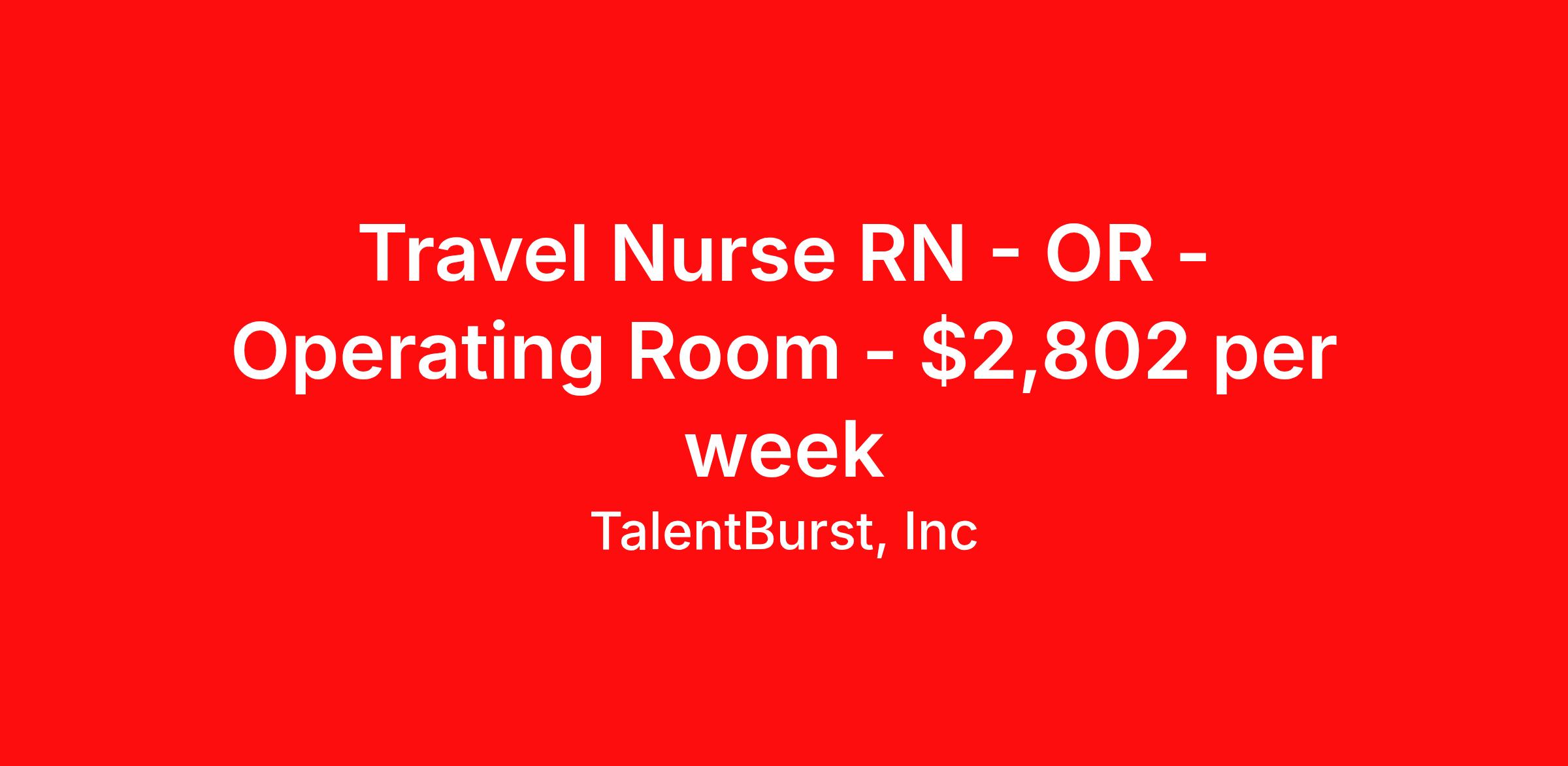 TalentBurst, Inc is seeking a travel nurse RN OR - Operating Room for a travel nursing job in camden, New Jersey. Job Description & Requirements Specialty: OR - Operating Room Discipline: RN Start Date: 03/23/2026 Duration: 13 weeks 36 hours per week Shift: 12 hours, days Employment Type: Travel Operating Room (OR) Registered Nurse (RN) Camden, NJ 13 Weeks 36 Hours/week Days 12 (11:00 AM - 11:00 PM) Job Summary We are seeking an experienced General Operating Room (OR) Registered Nurse (RN) to join our surgical team at facility. In this critical role, you will provide high-quality nursing care in a fast-paced operating room environment, ensuring patient safety, coordinating perioperative care, and collaborating with multidisciplinary teams. This position requires a commitment to excellence in trauma and surgical nursing, with a focus on Level 1 trauma cases. Key Responsibilities Provide direct nursing care to patients in the operating room, including preoperative assessment, intraoperative monitoring, and postoperative handoff. Assist in surgical procedures, ensuring sterile technique and adherence to safety protocols. Monitor patient vital signs, administer medications, and respond to emergencies during surgery. Coordinate with surgeons, anesthesiologists, and other OR staff to facilitate efficient workflow and patient care. Maintain accurate documentation of patient care, including surgical records and quality monitoring. Ensure compliance with infection control standards and regulatory requirements. Participate in quality improvement initiatives to enhance patient outcomes and safety. Demonstrate strong organizational skills in managing OR schedules, equipment, and resources. Qualifications and Requirements Active New Jersey (NJ) RN license required. Bachelor of Science in Nursing (BSN) degree preferred. Minimum of 3 years of professional OR nursing experience. Level 1 trauma experience required. Certifications: Basic Life Support (BLS) and NIH Stroke Scale (NIHSS) required. Excellent attention to detail for ensuring patient safety and quality monitoring. Strong organizational skills for coordinating care across the OR. Ability to work in a high-stress environment and make quick, critical decisions. Commitment to teamwork, patient advocacy, and continuous professional development. Work Schedule and Additional Details Shift : 11:00 AM to 11:00 PM (11a-11p). Holiday Requirements : 1 summer holiday and 1 fall/winter holiday. If off on the holiday, must work the day before or the day after. Must also work one evening shift and one day shift. Additionally, must work a winter hallmark and spring hallmark event. MN About TalentBurst, Inc TalentBurst Health & Life Sciences is an established provider of healthcare workforce solutions, servicing healthcare facilities across the United States for over 15 years. As a Joint Commission Certified Agency, our commitment to quality, integrity, and exceptional service has made us a trusted name in the healthcare staffing landscape. Our mission is to bridge the gap between healthcare professionals seeking fulfilling opportunities and healthcare organizations striving to maintain their high standards of care. We are committed to providing top-notch healthcare professionals with access to facilities where they can focus on delivering exceptional patient care and thrive. Whether you're a nurse, allied health professional, or administrative personnel, we have the expertise to match your skills and aspirations with the perfect placement.