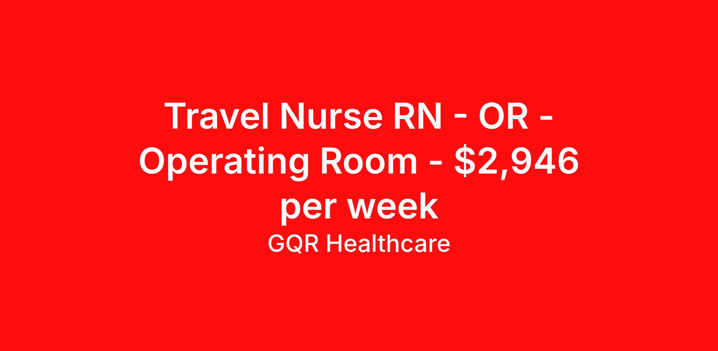GQR Healthcare is seeking a travel nurse RN OR - Operating Room for a travel nursing job in Los Angeles, California. Job Description & Requirements Specialty: OR - Operating Room Discipline: RN Start Date: 04/06/2026 Duration: 13 weeks 36 hours per week Shift: 12 hours Employment Type: Travel Contract - W2 Operating Room (OR) Registered Nurse (RN) Job Location: Los Angeles, California Start Date: April 6, 2026 Profession: Registered Nurse (RN) Facility: Hospital Estimated Pay: $2906.27 - $3001.27 Duration:13 weeks Specialty:Operating Room (OR) Shift: Shift Details: 3x12 null Job Type: Travel *Estimated weekly pay includes projected hourly wages and weekly meal and lodging per diems for eligible clinicians based on nationally published GSA rates. Actual weekly pay and per diems may differ from the amount shown and are subject to change during an assignment. Benefits: Day 1 Insurance Cigna medical, MetLife dental and vision insurance License reimbursement for new licenses needed for each assignment Discounts with hotels and rental cars A dedicated recruiter and support team that will help you every step of the way to sure you start on time and have an exceptional experience Referral bonus up to $700 About the Company: Finding the right role is about more than just matching skills to a job—it’s about aligning with your goals, values, and the way you want to work. As an award-winning talent partner, we support healthcare professionals through every step of that process, offering meaningful opportunities, clear guidance, and long-term partnership. From our first conversation to your first day on the job (and beyond!), we’re here to help you move forward with confidence. GQR Job ID 785915. Pay package is based on 12 hour shifts and 36 hours per week (subject to confirmation) with tax-free stipend amount to be determined. Posted job title: Registered Nurse (RN) About GQR Healthcare GQR’s Healthcare team specializes in connecting experts within the industry to highly skilled healthcare professionals across the US market. In the competitive healthcare market, we recognize that the industry’s common goals of improved quality of care and patient outcomes are wholly reliant upon the professionals directly supporting these initiatives. Leveraging our extensive candidate network, we deliver continuity of care for the communities our partners serve to ensure the patient experience is of the highest quality. Through deep market specialization and a unique approach to talent acquisition, GQR Healthcare provides an unparalleled and personalized experience across all medical specialties in nursing and within diverse healthcare platforms across the industry.