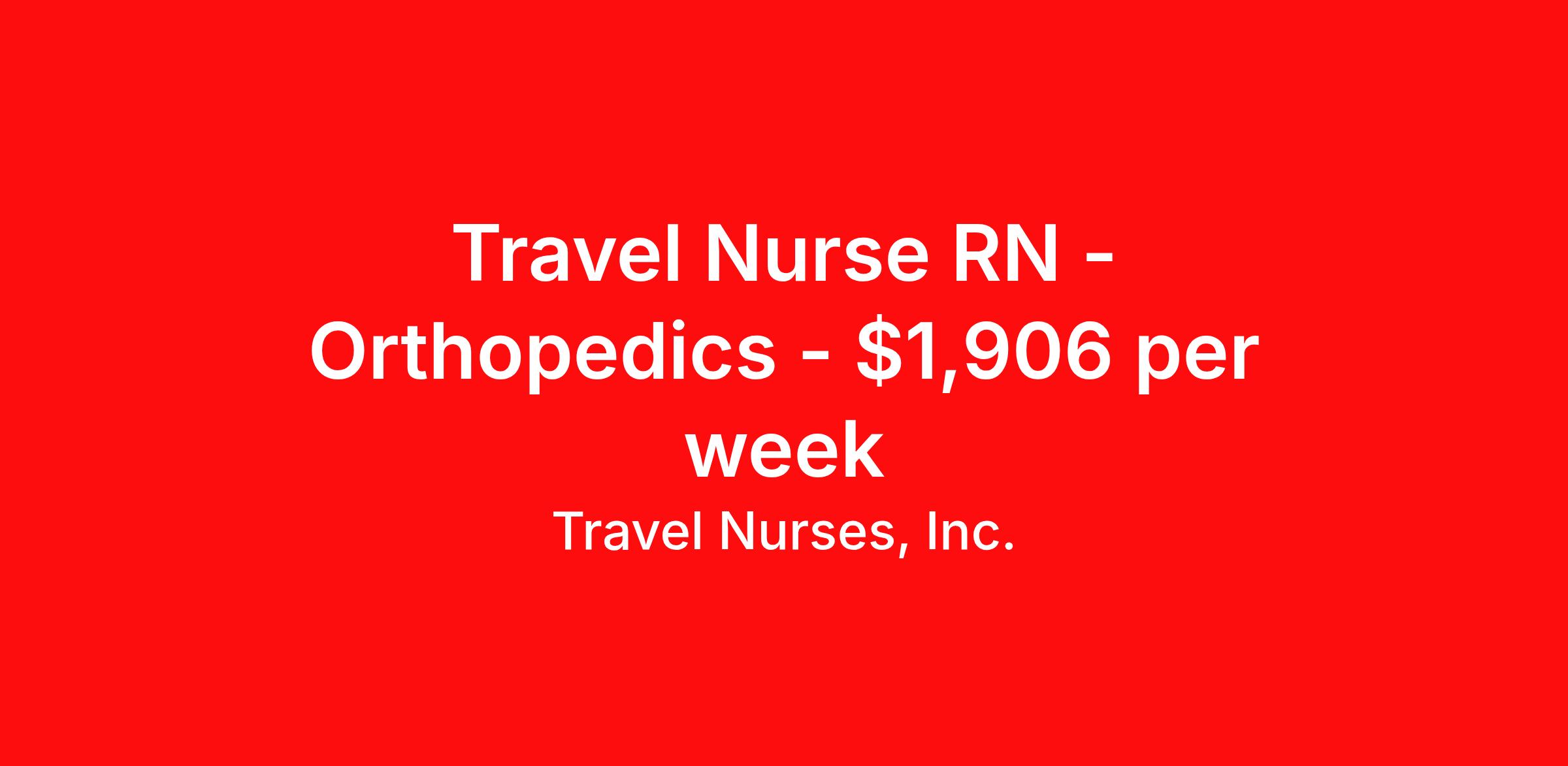 Travel Nurses, Inc. is seeking a travel nurse RN Orthopedics for a travel nursing job in Asheville, North Carolina. Job Description & Requirements Specialty: Orthopedics Discipline: RN Start Date: ASAP Duration: 13 weeks 36 hours per week Shift: 12 hours Employment Type: Travel Travel Nurses, Inc. Job ID 300256. Pay package is based on 12 hour shifts and 36 hours per week (subject to confirmation) with tax-free stipend amount to be determined. Posted job title: BACKFILL - TRAVEL - RN - ORTHO (605) - 6:45AM-7:15PM About Travel Nurses, Inc. Travel Nurses, Inc. is a leading healthcare staffing agency that provides healthcare professionals with opportunities to work across the country. Founded by nurses in 1988, TNI has more than 30 years of experience in the industry. The agency initially focused on staffing operating room settings in the MidSouth. However, this quickly evolved to encompass all nursing specialties and allied health fields nationwide. At the heart of our mission is a profound respect for nurses, whom we consider the cornerstone of healthcare. This acknowledgment extends beyond the nursing profession alone. Travel Nurses, Inc. now proudly embraces a wide array of healthcare professionals, recognizing their crucial roles in our collective mission. Travel Nurses, Inc. is dedicated to providing comprehensive support and opportunities that will help facilitate complete career mobility in the healthcare field. Our commitment to transparency ensures that all professionals, not just nurses, can confidently accept any assignment without financial uncertainties. We prioritize our professionals’ well-being with comprehensive benefits packages, including day-one healthcare coverage, competitive salaries, bonuses and incentives. This underscores our unwavering commitment to offering the best possible rewards and support for all the professionals we serve. Benefits Weekly pay Continuing Education 401k retirement plan Wellness and fitness programs Mileage reimbursement Referral bonus Employee assistance programs Medical benefits Dental benefits Vision benefits Benefits start day 1 License and certification reimbursement Life insurance Retention bonus