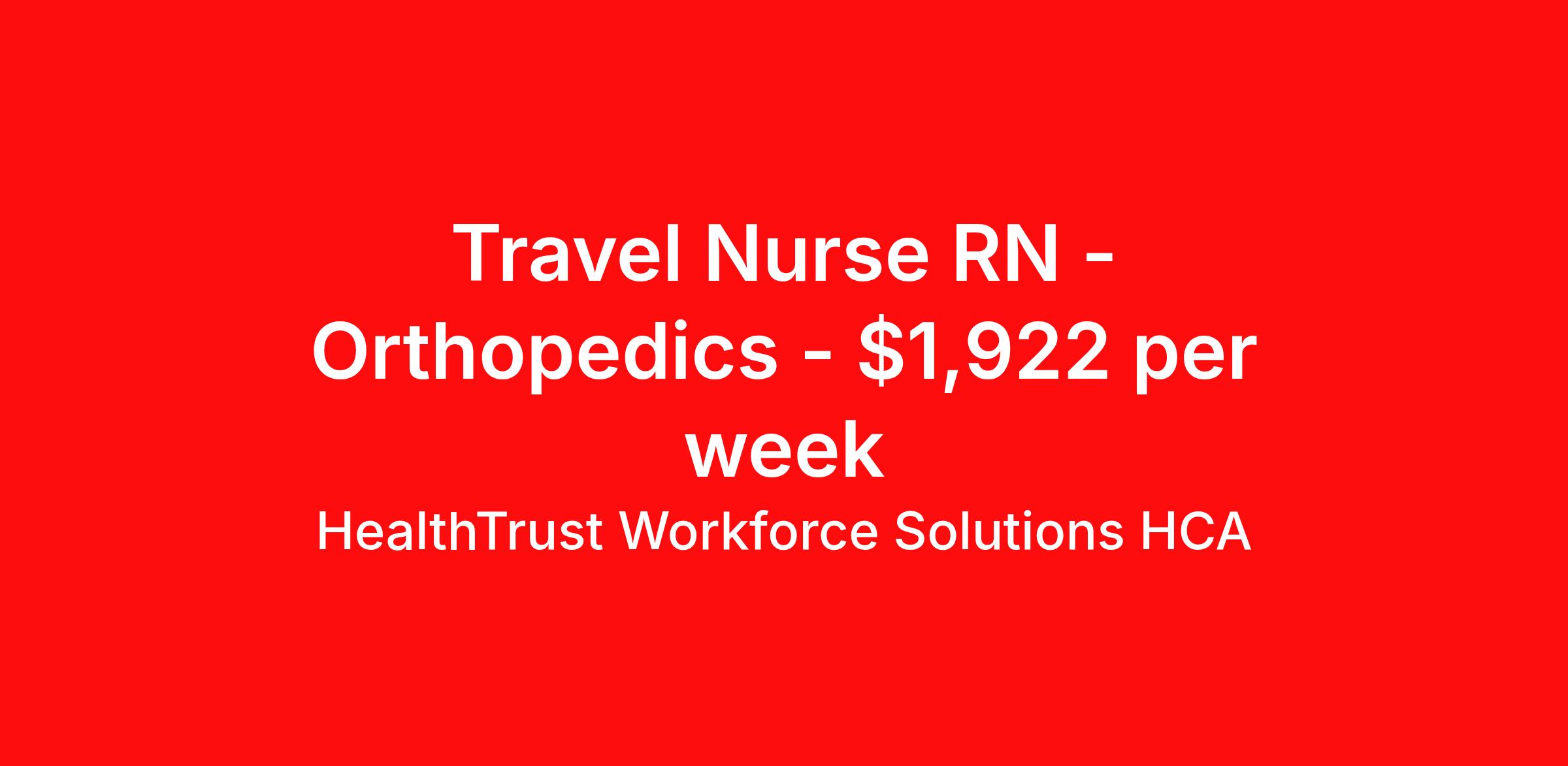 HealthTrust Workforce Solutions HCA is seeking a travel nurse RN Orthopedics for a travel nursing job in Gainesville, Florida. Job Description & Requirements Specialty: Orthopedics Discipline: RN Duration: 13 weeks 36 hours per week Shift: 12 hours, nights Employment Type: Travel 948717 About HealthTrust Workforce Solutions HCA At HealthTrust Workforce Solutions, healthcare is not just about the four walls of a facility but about the people who provide and receive care. Our focus is on empowering healthcare professionals to deliver exceptional patient experiences by providing them with the necessary skills, tools, and support. We partner with healthcare facilities nationwide to ensure that the right professionals are in the right roles. We prioritize our clinicians by giving them a voice and access to opportunities to fulfill their mission of improving lives by providing quality patient care. We are committed to our core values of Trust, Innovation, Adaptability, Courage, and Accountability. We are dedicated to positively impacting the healthcare industry by providing first-priority access to more than 200,000 jobs nationwide to our healthcare professionals. Join us and be part of the HealthTrust family, where you can make a difference every day. We embrace our changing environment, and we maintain a culture that has a rich tradition of transforming itself to meet the challenges of the future. MISSION STATEMENT While putting great people in the right roles is essential, our mission is far greater. We want our clinicians to be part of the HealthTrust family, where healthcare professionals have a voice and are empowered with the right tools and opportunities to fulfill their personal mission of improving lives. Plus, as a preferred partner to thousands of top-performing hospitals, we provide our healthcare professionals with first-priority access to more than 200,000 jobs nationwide. Benefits Dental benefits Vision benefits Referral bonus Continuing Education Life insurance