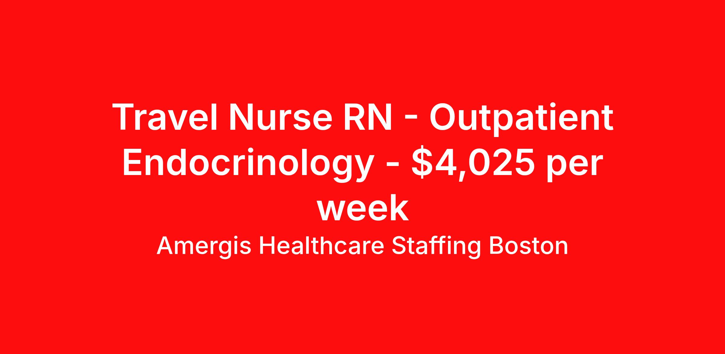 Amergis Healthcare Staffing Boston is seeking a travel nurse RN Outpatient Endocrinology for a travel nursing job in Worcester, Massachusetts. Job Description & Requirements Specialty: Endocrinology Discipline: RN Duration: 13 weeks 40 hours per week Shift: 10 hours, days Employment Type: Travel License Requirements : MA license. Willing to consider those without MA licenses at time of submission. Experience Requirements : Must have cycle management experience to be submitted. IVF and Reproductive Endocrinology experience required. Unit Details : Reproductive endocrinology and infertility nurse. Outpatient clinic setting. About Amergis Healthcare Staffing Boston Amergis, formerly known as Maxim Healthcare Staffing, has served our clients and communities by connecting people to the work that matters since 1988. We provide meaningful opportunities to our extensive network of healthcare and school-based professionals, ready to work in any hospital, government facility, or school. Through partnership and innovation, Amergis creates unmatched staffing experiences to deliver the best workforce solutions. Benefits Referral bonus