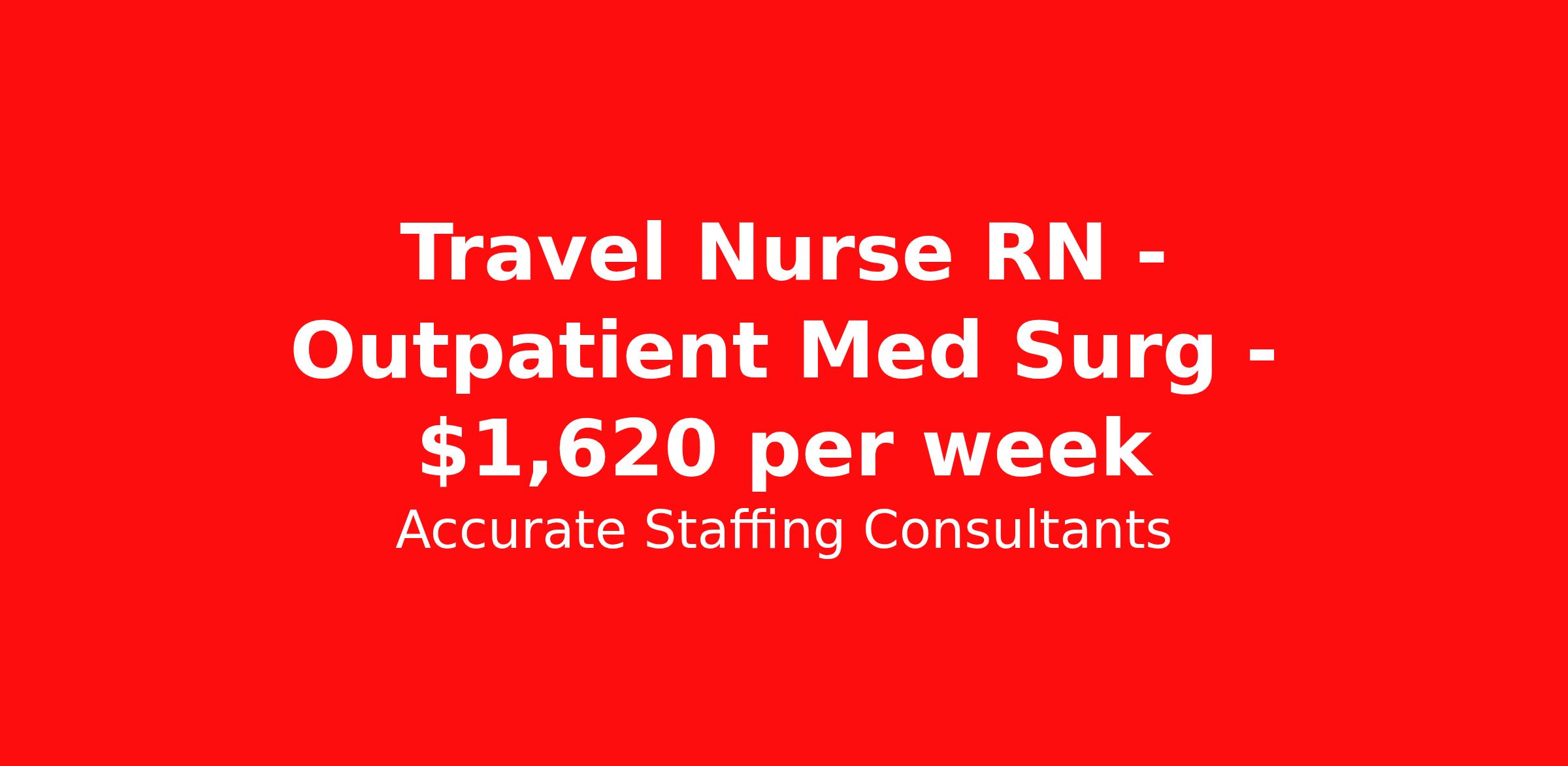 Accurate Staffing Consultants is seeking a travel nurse RN Outpatient Med Surg for a travel nursing job in Alpharetta, Georgia. Job Description & Requirements Specialty: Med Surg Discipline: RN Start Date: 04/06/2026 Duration: 11 weeks 40 hours per week Shift: 8 hours, days Employment Type: Travel AccurateStaffing Job ID 4710. Pay package is based on 8 hour shifts and 40 hours per week (subject to confirmation) with tax-free stipend amount to be determined. Posted job title: RN - Outpatient