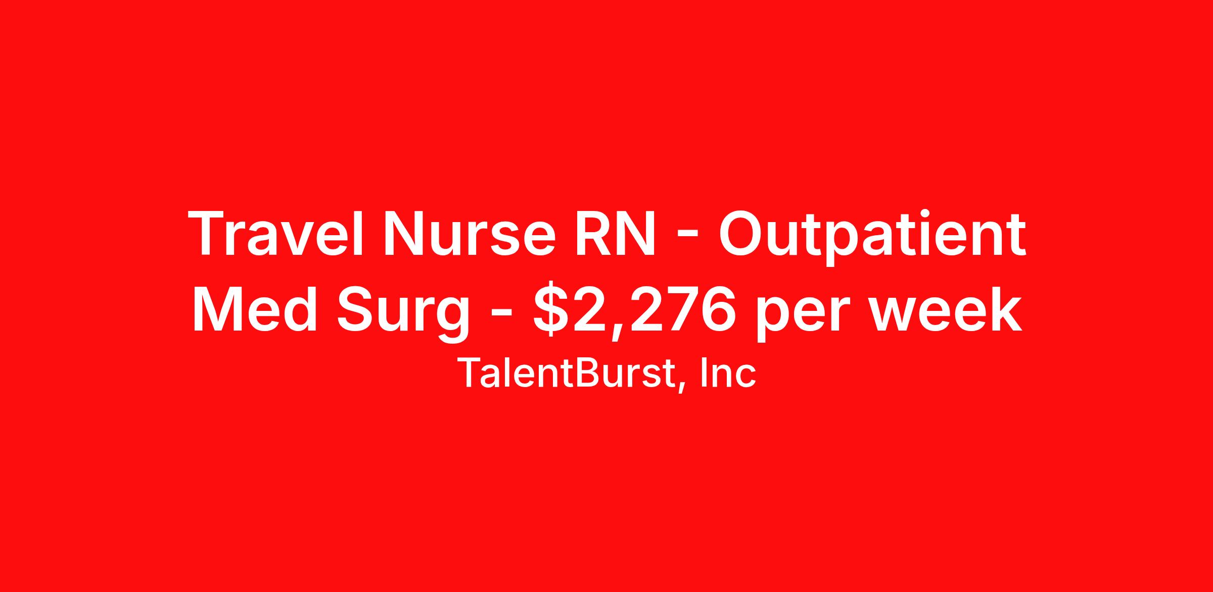 TalentBurst, Inc is seeking a travel nurse RN Outpatient Med Surg for a travel nursing job in Atlanta, Georgia. Job Description & Requirements Specialty: Med Surg Discipline: RN Start Date: 04/20/2026 Duration: 12 weeks 40 hours per week Shift: 8 hours, days Employment Type: Travel Job Title: Registered Nurse - Outpatient Services No local candidates within 50 miles Schedule 830a-5p Varies 12 weeks Short Description: Gyn Onc - RN Outpatient Min of 2 years of experience within specialty Required BLS Acute/Can accept Med Surg RN JOB DESCRIPTION Position Title: Registered Nurse FLSA Status: Non-Exempt Department: All Departments/Campuses, as Assigned Reports To: Supervisor, Coordinator, or Manager Occupational Summary The Registered Professional Nurse (RN) independently plans and delivers patient-centered care in accordance with physician orders, established clinical guidelines, and the scope of practice defined by the Georgia Nurse Practice Act. Professional nursing practice aligns with the American Nurses Association (ANA) Scope and Standards of Practice , emphasizing clinical excellence, leadership, accountability, and evidence-based care. The Staff RN is a competent nurse who manages care for an assigned patient population, demonstrating advanced clinical judgment, adaptability, and professional growth. Primary Nursing Duties and Responsibilities – Staff RN Demonstrate clinical competency in the management of complex patients and family care needs. Provide safe, effective, and evidence-based patient care in accordance with current clinical guidelines. Independently implement the nursing process and adapt care to rapidly changing patient conditions. Utilize patient care technology and clinical information systems efficiently and safely. Delegate patient care appropriately in alignment with scope of practice. Serve as a preceptor and mentor for new employees and students. Establish and pursue professional development and lifelong learning goals. Perform self-assessment and identify opportunities for growth. Recognize and address ethical issues in clinical practice. Collaborate with interdisciplinary teams to ensure continuity of care. Apply evidence-based policies and procedures in clinical decision-making. Participate in quality improvement, patient safety initiatives, and regulatory readiness activities. Additional Duties and Responsibilities Perform non-waived point-of-care testing within scope of practice, in accordance with all applicable standards and regulations, following successful completion of required training and competency validation (as applicable to department). Perform other duties as assigned by supervisor. Disclaimer: The above statements are intended to describe the general nature and level of work performed and are not intended to be an exhaustive list of all responsibilities. Patient Population Patient populations served vary by unit and may include: Unit/Department Neonate/Infant Child Adolescent Adult Geriatric Bone Marrow Transplant ✓ ✓ Breast Care Center ✓ ✓ ✓ Cancer Center (Radiation Oncology) ✓ ✓ ✓ Critical Care ✓ ✓ ✓ Emergency Department ✓ ✓ ✓ ✓ ✓ Family Centered Care ✓ ✓ ✓ GI Lab ✓ ✓ ✓ High Risk Perinatal ✓ ✓ ✓ IV Therapy ✓ ✓ ✓ Labor and Delivery ✓ ✓ ✓ Medical/Surgical ✓ ✓ ✓ Neurosciences ✓ ✓ ✓ Oncology ✓ ✓ ✓ Pain Treatment & Spine Centers ✓ ✓ ✓ Radiology ✓ ✓ ✓ ✓ Renal Services ✓ ✓ Screen Atlanta ✓ ✓ ✓ Special Care Nurseries ✓ Surgical Services ✓ ✓ ✓ ✓ ✓ Urodiagnostics ✓ ✓ Required Qualifications Graduate of an accredited school of nursing Current Registered Nurse (RN) license in the State of Georgia in good standing Minimum of two (2) years of full-time RN experience (post-orientation or residency) Current Basic Life Support (BLS) certification through the American Heart Association Additional certifications (e.g., ACLS, NRP, PALS) as required by specific unit Preferred Qualifications Bachelor of Science in Nursing (BSN) National certification in a clinical specialty Additional unit-specific experience or certifications Core Competencies Language Skills Effective communication with patients, families, and healthcare teams Ability to read and interpret clinical, technical, and regulatory materials Writing skills for documentation and communication as required Mathematical Skills Basic math proficiency Reasoning Ability Ability to interpret complex instructions and clinical data Strong problem-solving skills in dynamic healthcare environments Service Excellence Expectations Demonstrates professionalism Communicates respectfully and effectively Responds promptly to patient and team needs Takes ownership and accountability Demonstrates compassion and teamwork Supervision Reports To: Supervisor, Coordinator, or Manager, Nursing Services Supervises: LPNs, CNAs, Technicians, Medical Assistants, and other support staff (unit-specific) Working Conditions Exposure to infectious diseases, hazardous materials, needlesticks, and bodily fluids Potential exposure to radiation and radioactive materials Hepatitis B vaccination offered Corporate Compliance Adheres to all organizational policies, laws, regulations, and standards of conduct. Reports any suspected violations through appropriate channels. Physical Demands (Refer to unit-specific requirements for additional detail) Activity Frequency Close visual work (computer, documentation) Frequent Standing, walking, light lifting ( 50 lbs) Occasional to Frequent depending on unit Disclaimer This job description outlines the general nature and level of work performed and is not intended to be a comprehensive list of all duties and responsibilities. TB_HC TB_ZR Talent Burst Job ID 26-07301. Pay package is based on 8 hour shifts and 40 hours per week (subject to confirmation) with tax-free stipend amount to be determined. Posted job title: Registered Nurse - Outpatient Services About TalentBurst, Inc TalentBu