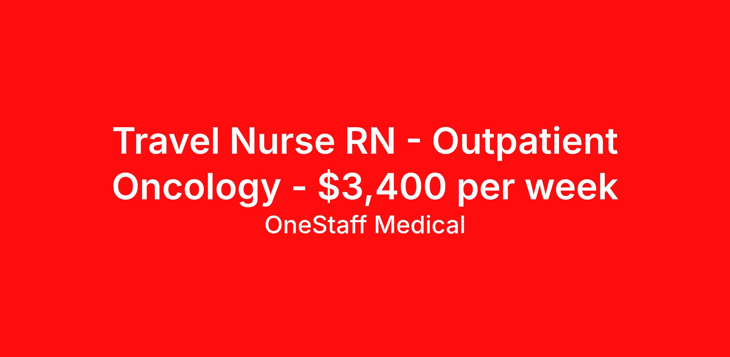 OneStaff Medical is seeking a travel nurse RN Outpatient Oncology for a travel nursing job in La Mesa, California. Job Description & Requirements Specialty: Oncology Discipline: RN Start Date: 03/30/2026 Duration: 13 weeks 40 hours per week Shift: 8 hours, days Employment Type: Travel About OneStaff Medical You deserve a partner that is working for you. Be bold and let us do just that. We’ll take care of you while you are away from your own “home base” in every way we can, and ideally do more than you expect. Your team at OneStaff is dedicated to finding the perfect assignments (for you), negotiate the best rates and handles any issues that may arise while you are on assignment. We take great pride in building relationships with our traveling professionals and we enjoy hearing about your experiences. Whatever the need, we are here to help along the journey. We understand you are the heart and soul of what we are. Whether it is housing, payroll, travel, benefits, or just a friendly voice to talk to, we are there every step of the way. The company you choose is the most important decision you will make in your traveling career. We get that, so we’re committed to you 24 hours-a-day, 7 days-a-week. We’re your “one” solution in travel assignments and here to assist whether helping with accelerating your trajectory towards your career goals or meeting your travel requirements. Benefits Weekly pay Holiday Pay Guaranteed Hours 401k retirement plan Pet insurance Company provided housing options Sick pay Wellness and fitness programs Referral bonus Medical benefits Dental benefits Vision benefits
