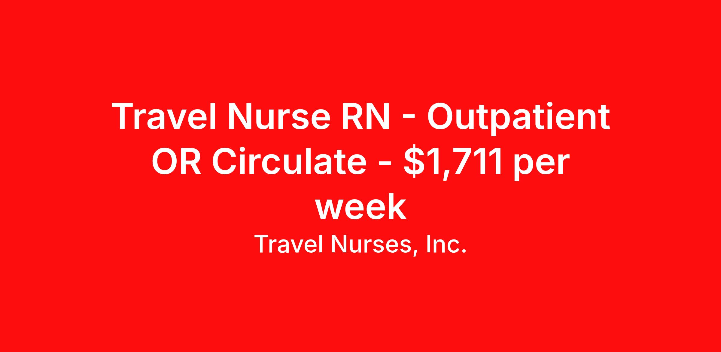 Travel Nurses, Inc. is seeking a travel nurse RN Outpatient OR Circulate for a travel nursing job in Stockbridge, Georgia. Job Description & Requirements Specialty: OR Circulate Discipline: RN Start Date: 04/13/2026 Duration: 13 weeks 36 hours per week Shift: 12 hours Employment Type: Travel Travel Nurses, Inc. Job ID 309336. Pay package is based on 12 hour shifts and 36 hours per week (subject to confirmation) with tax-free stipend amount to be determined. Posted job title: Outpatient Surgery Registered Nurse About Travel Nurses, Inc. Travel Nurses, Inc. is a leading healthcare staffing agency that provides healthcare professionals with opportunities to work across the country. Founded by nurses in 1988, TNI has more than 30 years of experience in the industry. The agency initially focused on staffing operating room settings in the MidSouth. However, this quickly evolved to encompass all nursing specialties and allied health fields nationwide. At the heart of our mission is a profound respect for nurses, whom we consider the cornerstone of healthcare. This acknowledgment extends beyond the nursing profession alone. Travel Nurses, Inc. now proudly embraces a wide array of healthcare professionals, recognizing their crucial roles in our collective mission. Travel Nurses, Inc. is dedicated to providing comprehensive support and opportunities that will help facilitate complete career mobility in the healthcare field. Our commitment to transparency ensures that all professionals, not just nurses, can confidently accept any assignment without financial uncertainties. We prioritize our professionals’ well-being with comprehensive benefits packages, including day-one healthcare coverage, competitive salaries, bonuses and incentives. This underscores our unwavering commitment to offering the best possible rewards and support for all the professionals we serve. Benefits Weekly pay Continuing Education 401k retirement plan Wellness and fitness programs Mileage reimbursement Referral bonus Employee assistance programs Medical benefits Dental benefits Vision benefits Benefits start day 1 License and certification reimbursement Life insurance Retention bonus