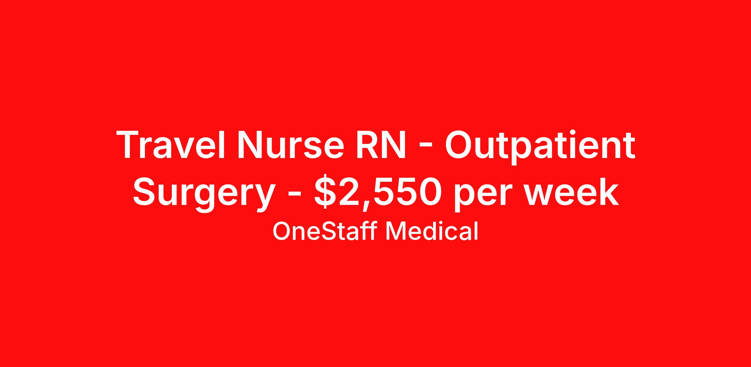 OneStaff Medical is seeking a travel nurse RN Outpatient Surgery for a travel nursing job in Grand Rapids, Michigan. Job Description & Requirements Specialty: Outpatient Surgery Discipline: RN Start Date: ASAP Duration: 13 weeks 40 hours per week Shift: 8 hours, days Employment Type: Travel About OneStaff Medical You deserve a partner that is working for you. Be bold and let us do just that. We’ll take care of you while you are away from your own “home base” in every way we can, and ideally do more than you expect. Your team at OneStaff is dedicated to finding the perfect assignments (for you), negotiate the best rates and handles any issues that may arise while you are on assignment. We take great pride in building relationships with our traveling professionals and we enjoy hearing about your experiences. Whatever the need, we are here to help along the journey. We understand you are the heart and soul of what we are. Whether it is housing, payroll, travel, benefits, or just a friendly voice to talk to, we are there every step of the way. The company you choose is the most important decision you will make in your traveling career. We get that, so we’re committed to you 24 hours-a-day, 7 days-a-week. We’re your “one” solution in travel assignments and here to assist whether helping with accelerating your trajectory towards your career goals or meeting your travel requirements. Benefits Weekly pay Holiday Pay Guaranteed Hours 401k retirement plan Pet insurance Company provided housing options Sick pay Wellness and fitness programs Referral bonus Medical benefits Dental benefits Vision benefits