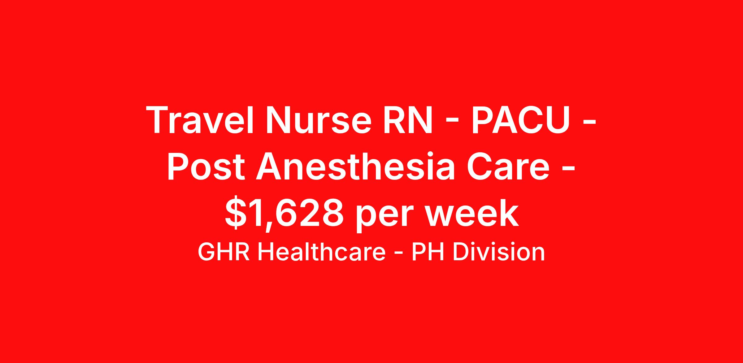GHR Healthcare - PH Division is seeking a travel nurse RN PACU - Post Anesthesia Care for a travel nursing job in Wilmington, North Carolina. Job Description & Requirements Specialty: PACU - Post Anesthesia Care Discipline: RN Start Date: 04/20/2026 Duration: 13 weeks 36 hours per week Shift: 12 hours Employment Type: Travel PACU Registered Nurse (RN) – Travel RN | Wilmington, NC (28401) PACU Registered Nurse (Travel RN) – Wilmington, NC (28401). 13-week travel contract; 12-hour day shifts; 1:2 patient ratio. Seeking an experienced PACU RN with ICU/critical care skills for perioperative and post-anesthesia care in coastal North Carolina. Join a dynamic healthcare team in Wilmington, NC (zip code 28401) and work in a fast-paced Post Anesthesia Care Unit (PACU) caring for a diverse surgical population. Wilmington offers beautiful beaches, a vibrant historic downtown, and great quality of life—an ideal destination for travel nurses and Registered Nurses looking for professional growth and a memorable assignment. Compensation Estimated Weekly Pay: $1490 - $1570 per week Key Job Details Position: PACU Registered Nurse (RN) / Travel RN Location: Wilmington, NC (28401) — Coastal North Carolina nursing job Contract Duration: 13 weeks (April 13, 2026 – July 13, 2026) Shift: 12-hour days (06:45 – 19:15), 3 shifts per week Hours per week: 36 Patient ratio: 1:2 Call requirement: Once every four weeks Float requirement: May float to surgical short stay unit for overflow Weekend requirement: Varies Orientation: Comprehensive, individualized orientation provided Qualifications / Job Requirements Minimum 2 years of recent PACU experience (Post Anesthesia Care Unit) ICU / critical care experience required—able to manage ICU-level care when PACU converts to ICU Travel RN experience required (travel nurse, travel RN assignments) Active RN license (North Carolina or Compact) Current certifications: ACLS, BLS, PALS Epic charting experience preferred (electronic health record experience) Preferred experience: charge nurse, conscious sedation, telemetry, ventilator management, pediatric PACU Comfort caring for patients across all age groups (infants, pediatrics, adolescents, adults, geriatrics) Ability to float to other units and participate in call rotations Responsibilities Provide Phase I and Phase II PACU care for post-operative and post-anesthesia patients Manage recovery and stabilization of surgical patients; convert to ICU-level care as needed Monitor and manage cardiac, respiratory, and neurological status using advanced monitoring (cardiac monitors, arterial lines, ICP monitoring, dopplers, fetal monitors, wound vacs) Administer and monitor procedural sedation, analgesia, and emergency medications per protocol Perform assessments, documentation, and handoffs using Epic and unit systems (perioperative documentation, post-op instructions) Collaborate with interdisciplinary teams (anesthesia, surgery, IV team, PT, RT, pharmacy, social work, rapid response) Participate in float assignments, call rotation, and emergency response (including Storm/Hurricane Team when needed) Why This PACU Nursing Job in Wilmington, NC? Opportunity to expand perioperative and critical care skills in a high-volume PACU Comprehensive orientation and supportive interdisciplinary team culture Work in a desirable coastal location—Wilmington, North Carolina—offering outdoor recreation, dining, and cultural activities Ideal for experienced travel nurses and Registered Nurses seeking short-term travel assignments and professional development Ready to apply? Apply now to join our healthcare team as a PACU Registered Nurse (Travel RN) in Wilmington, NC. Submit your resume and nursing credentials to be considered for this 13-week PACU nursing job. Join us and advance your perioperative and critical care nursing career! Benefits 401K with Matching, Healthcare, Dental and Vision Equal Opportunity We are an equal opportunity employer and value diversity across our organization. We do not discriminate on the basis of race, religion, color, national origin, gender, sexual orientation, age, marital status, veteran status, or disability status. Planet Healthcare Job ID 467057. Pay package is based on 12 hour shifts and 36 hours per week (subject to confirmation) with tax-free stipend amount to be determined. Posted job title: PACU About GHR Healthcare - PH Division For over 30 years, GHR Healthcare has been the bridge between healthcare professionals and the facilities that need them nationwide. We're committed to uncovering your ideal fit, supported by GHR's dedication to competitive compensation, transparent communication, and a devoted team that genuinely cares about your career journey. You can trust us to stand by your side as your advocate, confidante, and partner in advancing your career. At GHR, care and consideration are at the heart of everything we do. Visit ghrhealthcare.com to learn more.