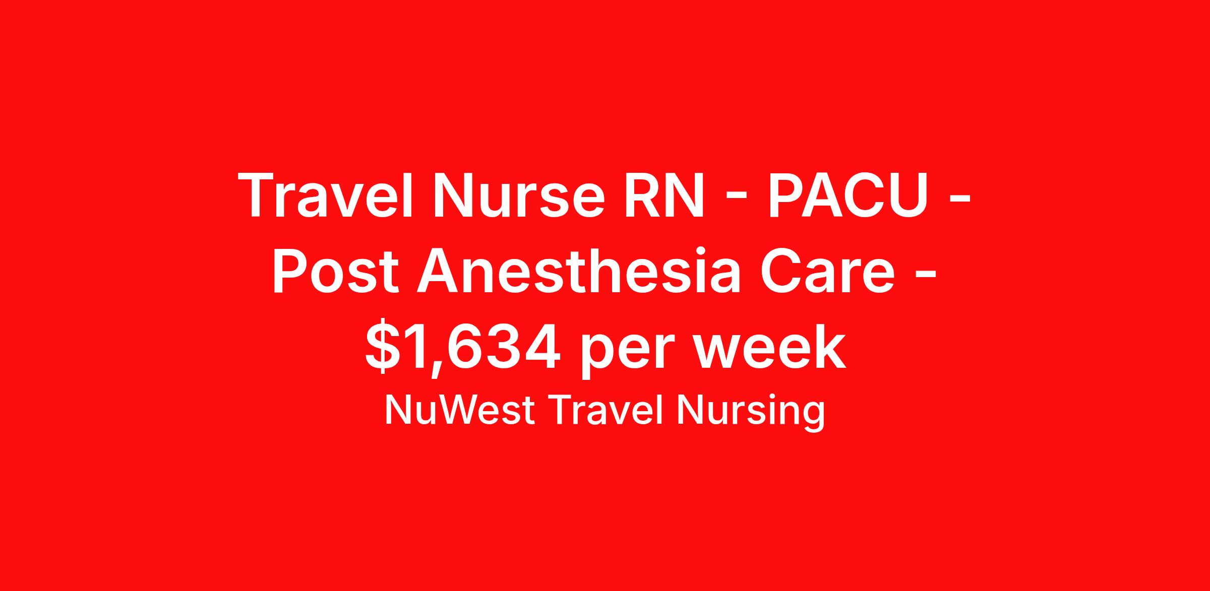 NuWest Travel Nursing is seeking a travel nurse RN PACU - Post Anesthesia Care for a travel nursing job in Asheville, North Carolina. Job Description & Requirements Specialty: PACU - Post Anesthesia Care Discipline: RN Duration: 13 weeks 36 hours per week Shift: 12 hours Employment Type: Travel We have a new assignment for RN - PACU in Asheville, NC and are interviewing ASAP. This is a travel assignment, 3x12 Days position at a great facility. Pay Range: $1501.5 - $1766.47 Per Week Benefits include medical, dental, vision, 401K, weekly direct deposit, and more! NuWest Travel Nursing Job ID 263386. Pay package is based on 12 hour shifts and 36 hours per week (subject to confirmation) with tax-free stipend amount to be determined.