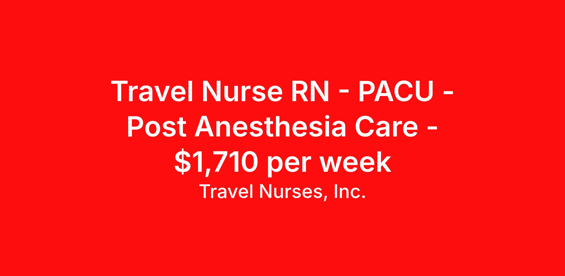 Travel Nurses, Inc. is seeking a travel nurse RN PACU - Post Anesthesia Care for a travel nursing job in Nashville, Tennessee. Job Description & Requirements Specialty: PACU - Post Anesthesia Care Discipline: RN Start Date: ASAP Duration: 13 weeks 36 hours per week Shift: 12 hours Employment Type: Travel Travel Nurses, Inc. Job ID 303240. Pay package is based on 12 hour shifts and 36 hours per week (subject to confirmation) with tax-free stipend amount to be determined. Posted job title: TRAVEL - RN - PACU - COST CENTER (709) - 8:00AM - 8:00PM About Travel Nurses, Inc. Travel Nurses, Inc. is a leading healthcare staffing agency that provides healthcare professionals with opportunities to work across the country. Founded by nurses in 1988, TNI has more than 30 years of experience in the industry. The agency initially focused on staffing operating room settings in the MidSouth. However, this quickly evolved to encompass all nursing specialties and allied health fields nationwide. At the heart of our mission is a profound respect for nurses, whom we consider the cornerstone of healthcare. This acknowledgment extends beyond the nursing profession alone. Travel Nurses, Inc. now proudly embraces a wide array of healthcare professionals, recognizing their crucial roles in our collective mission. Travel Nurses, Inc. is dedicated to providing comprehensive support and opportunities that will help facilitate complete career mobility in the healthcare field. Our commitment to transparency ensures that all professionals, not just nurses, can confidently accept any assignment without financial uncertainties. We prioritize our professionals’ well-being with comprehensive benefits packages, including day-one healthcare coverage, competitive salaries, bonuses and incentives. This underscores our unwavering commitment to offering the best possible rewards and support for all the professionals we serve. Benefits Weekly pay Continuing Education 401k retirement plan Wellness and fitness programs Mileage reimbursement Referral bonus Employee assistance programs Medical benefits Dental benefits Vision benefits Benefits start day 1 License and certification reimbursement Life insurance Retention bonus