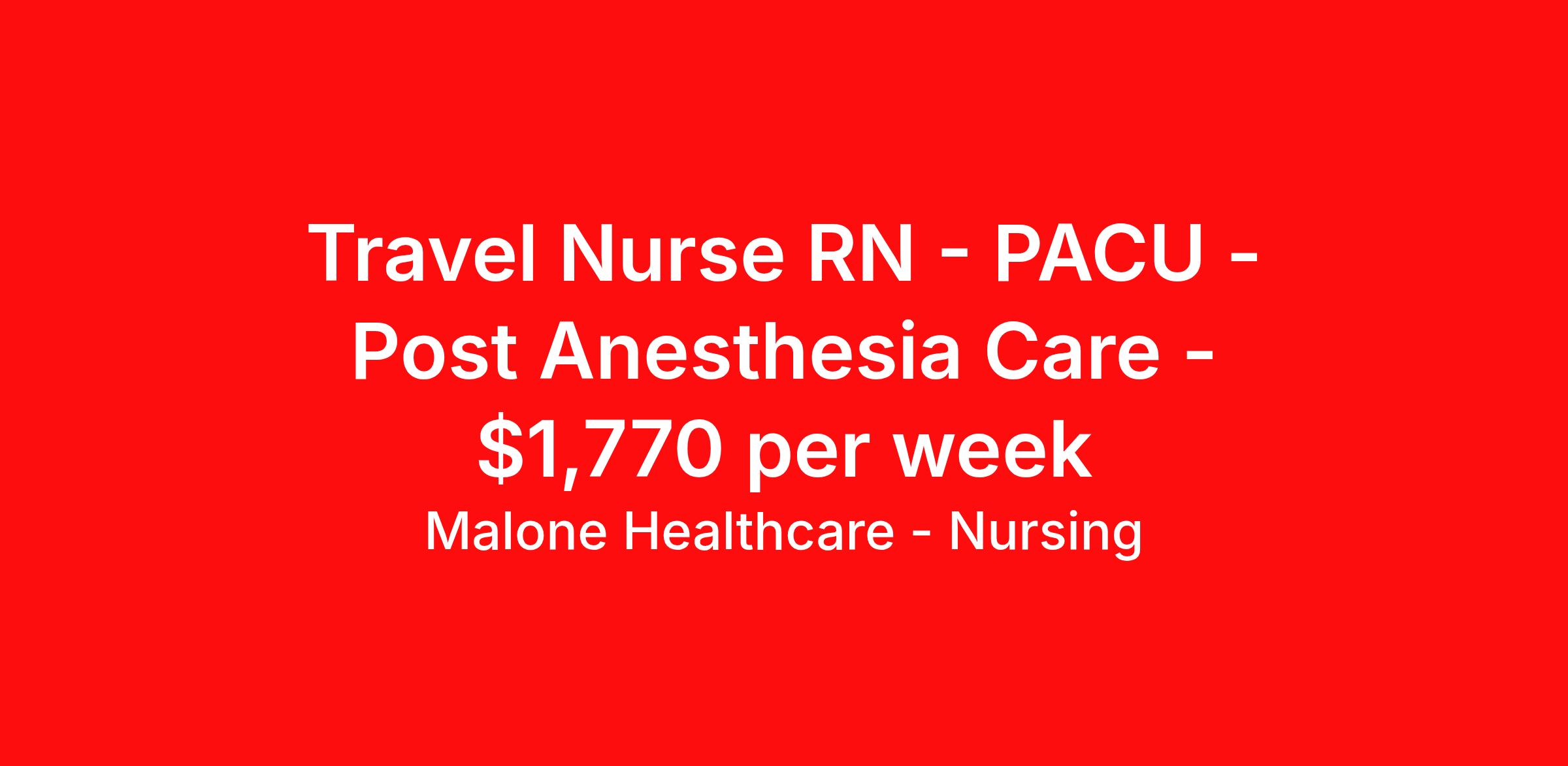 Malone Healthcare - Nursing is seeking a travel nurse RN PACU - Post Anesthesia Care for a travel nursing job in Louisville, Kentucky. Job Description & Requirements Specialty: PACU - Post Anesthesia Care Discipline: RN Duration: 13 weeks 36 hours per week Shift: 12 hours, days Employment Type: Travel About Malone Healthcare - Nursing With a commitment to providing a higher standard of service and experience in patient care, Malone Healthcare places expert nurses and allied health professionals in rewarding careers throughout the United States. As a leading healthcare staffing agency, Malone’s focus on compliance and integrity translates to a seamless experience for our team members and partner facilities. When you work with Malone Healthcare, you can rely on over 50 years of proven experience placing exceptional professionals in quality healthcare settings. Benefits Weekly pay Holiday Pay Guaranteed Hours Continuing Education 401k retirement plan Pet insurance Referral bonus Medical benefits Dental benefits Vision benefits License and certification reimbursement Life insurance