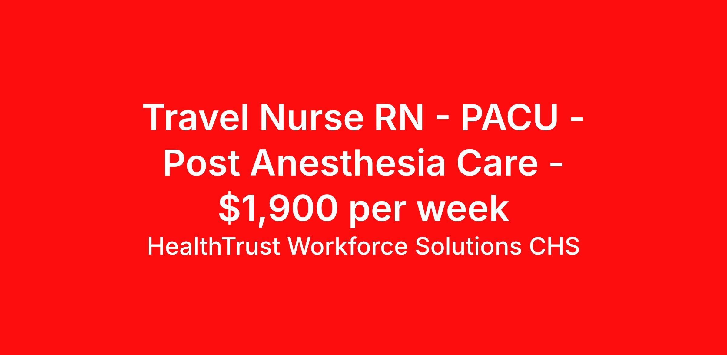 HealthTrust Workforce Solutions CHS is seeking a travel nurse RN PACU - Post Anesthesia Care for a travel nursing job in Oro Valley, Arizona. Job Description & Requirements Specialty: PACU - Post Anesthesia Care Discipline: RN Duration: 13 weeks 36 hours per week Shift: 12 hours, days Employment Type: Travel Oro Valley Hospital Position: PACU RN Shift 3/12's - 0545-1800 AND 0745-2030 O Experience: 2 Yrs. PACU Required: AZ License, BLS & ACLS EMR: Cerner