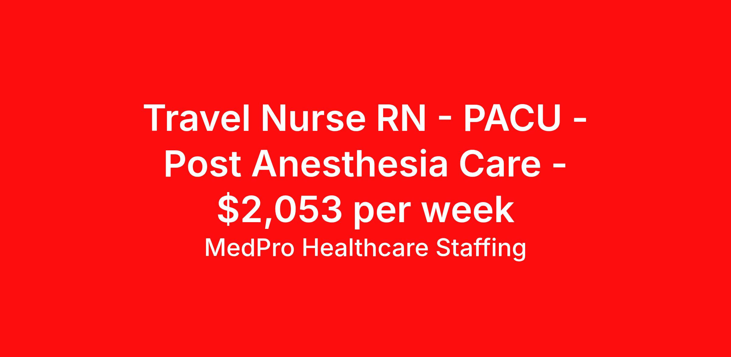 MedPro Healthcare Staffing is seeking a travel nurse RN PACU - Post Anesthesia Care for a travel nursing job in Saint Louis, Missouri. Job Description & Requirements Specialty: PACU - Post Anesthesia Care Discipline: RN Start Date: 04/27/2026 Duration: 13 weeks 36 hours per week Shift: 12 hours, nights Employment Type: Travel MedPro Healthcare Staffing , a Joint Commission-certified staffing agency, is seeking a quality PACU Registered Nurse (RN) for a travel assignment with one of our top healthcare clients. Requirements Active RN License Degree from accredited nursing program BLS, & ACLS Certifications Eighteen months of recent experience in an Acute Care PACU setting Other requirements to be determined by our client facility Benefits Weekly pay and direct deposit Full coverage of all credentialing fees Private housing or housing allowance Group Health insurance for you and your family Company-paid life and disability insurance Travel reimbursement 401(k) matching Unlimited Referral Bonuses up to $1,000 Duties Responsibilities Post Anesthesia Care Unit / PACU RN will assist in recovering the patients from anesthesia. They also monitor patients while they wake up from surgery until they are released, either by discharge to outpatient or transfer to the floor for their patient stay. Provide care for post-operative patients recovering from anesthesia, including general, regional, and local. Treats inpatients and outpatients according to their needs. Administer diligent care via monitoring, assessment, intervention, and continuous reassessment. About Agency MedPro Healthcare Staffing is a Joint Commission certified provider of contract staffing services. Since 1983, we have placed nursing and allied travelers in top healthcare facilities nationwide. Join us today for your very own MedPro Experience®. If qualified and interested, please call for immediate consideration. MedPro Staffing is an Equal Opportunity Employer. All applicants will be considered for employment without attention to race, color, religion, national origin, age, sex, disability, marital status or veteran status. Key Words: Registered Nurse, RN, Operating Room, Scrub, Circulate, OR, Contract Nurse, Travel Nurse, Agency RN, Travel RN, Nursing, Contract, Perioperative nurse *Weekly payment estimates are intended for informational purposes only and include a gross estimate of hourly wages and reimbursements for meal, incidental, and housing expenses. Your recruiter will confirm your eligibility and provide additional details. MedPro Job ID a0Fcx00000HkJ7VEAV. Pay package is based on 12 hour shifts and 36 hours per week (subject to confirmation) with tax-free stipend amount to be determined. Posted job title: PACU Registered Nurse Nursing: PACU - Recovery Room. About MedPro Healthcare Staffing At MedPro Healthcare Staffing , we believe no one cares more for caregivers than we do. Our mission is simple: you focus on your patients, and we’ll take care of the rest. As a Joint Commission-certified leader in temporary and contract healthcare staffing since 1983, MedPro has proudly connected nursing and allied travelers with top healthcare facilities across the nation. With thousands of job opportunities available nationwide, we make it easy to find assignments that align with your goals and lifestyle. Our on-staff clinical support team—alongside a compassionate group of experienced recruiters—provides hands-on guidance every step of the way. From Day 1 medical benefits and a 401(k) plan to personalized career support, we’re committed to ensuring every professional we serve feels valued, cared for, and empowered to succeed. Guided by a CEO who is a Registered Nurse, MedPro is built on a foundation of clinical insight and genuine compassion for the caregiving community. Through The MedPro Experience® , we deliver travel assignments that are rewarding, memorable, and designed to help you DREAM big, EXPLORE often, and ACHIEVE greatness. Benefits Day 1 medical, dental, and vision benefits for you and your family Weekly pay and direct deposit Unlimited Referral Bonuses starting at $500 On Staff Clinical Support Team Access to nationwide travel assignments MPX Mobile app -24/7 real-time access to jobs, credentials, assignment details, and more Full coverage of all credentialing fees Private housing or housing allowance Tax Free Per Diems, Housing Stipends and Travel Reimbursements Company-paid life and disability insurance Travel reimbursement 401(k) matching Benefits Weekly pay Referral bonus Employee assistance programs