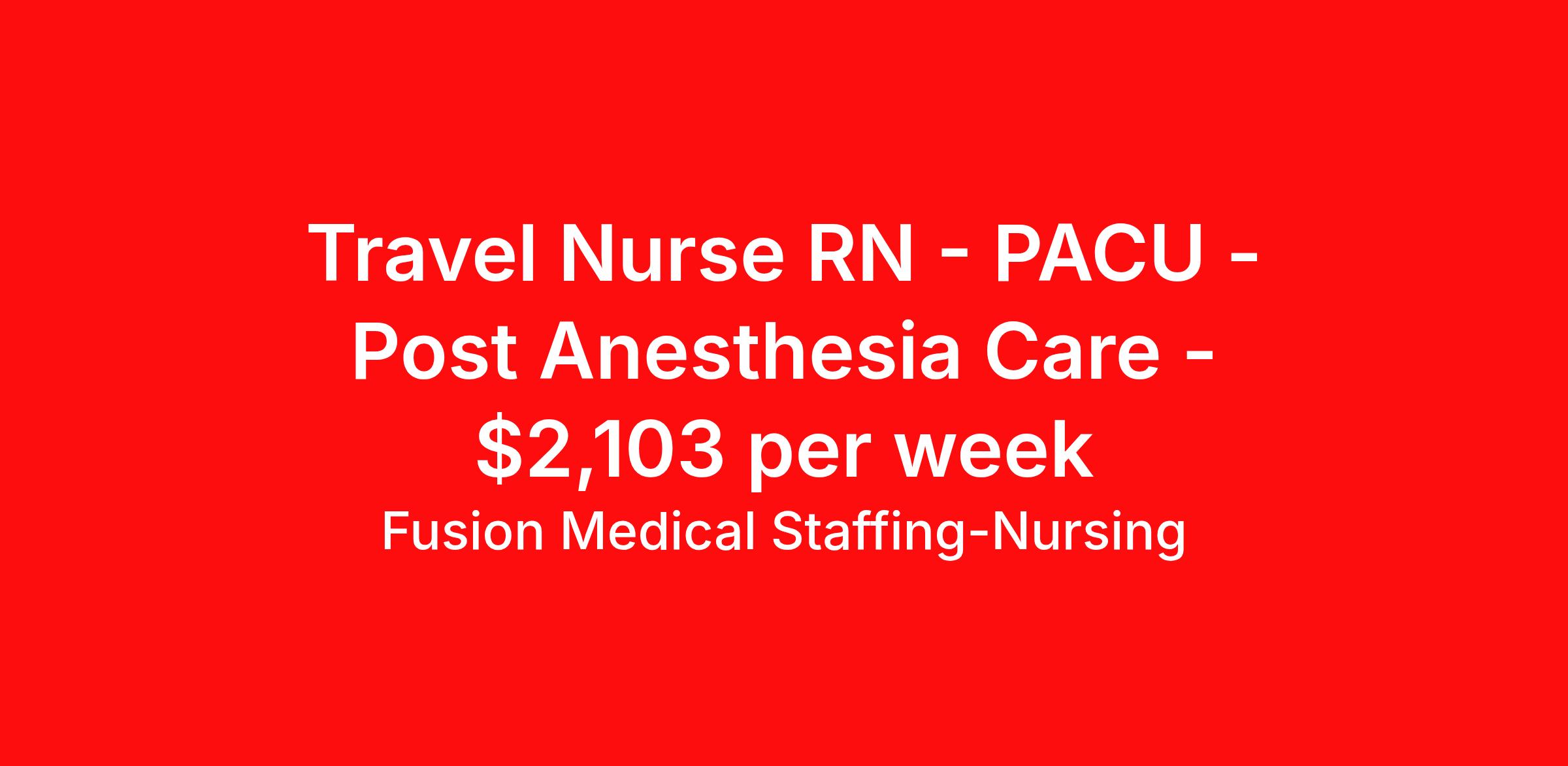 Fusion Medical Staffing-Nursing is seeking a travel nurse RN PACU - Post Anesthesia Care for a travel nursing job in Saint Louis, Missouri. Job Description & Requirements Specialty: PACU - Post Anesthesia Care Discipline: RN Start Date: 05/26/2026 Duration: 13 weeks 40 hours per week Shift: 8 hours, nights Employment Type: Travel Travel PACU RN Company: Fusion Medical Staffing Location: Facility in St. Louis, Missouri Job Details Fusion Medical Staffing is seeking a skilled PACU RN for a 13-week travel assignment in St. Louis, Missouri. As a member of our team, you'll have the opportunity to make a positive impact on the lives of patients while enjoying competitive pay, comprehensive benefits, and the support of a dedicated clinical team. Required Qualifications: One year of recent experience as a PACU RN Valid RN license in compliance with state regulations Current BLS (AHA/ARC) certification ACLS (AHA/ARC) certification Preferred Qualifications: PALS (AHA/ARC) or ENPC certifications Other certifications and licenses may be required for this position Summary: The PACU (Post-Anesthesia Care Unit) Registered Nurse provides specialized care to patients recovering from anesthesia and surgery. This role involves assessing patient recovery, implementing post-operative care plans, administering treatments, collaborating with the surgical team, and coordinating care for discharging or transporting patients. The PACU RN ensures patient safety and comfort during the critical recovery period, using advanced clinical skills, effective communication, and adherence to professional and regulatory standards. Essential Work Functions: Receive and conduct comprehensive assessments of patients transferring from the operating room and assess their post-anesthesia condition Monitor and evaluate patient’s vital signs, level of consciousness, and recovery from anesthesia Administer prescribed medications and treatments in accordance with approved post-anesthesia nursing techniques Maintain awareness of comfort and safety needs of recovering patients Observe and document patient conditions, treatments, and significant incidents and respond to anesthesia and treatments, notifying the care team of significant changes or adverse reactions Respond promptly to emergency situations utilizing PACU nursing standards, policies, procedures, and protocols Accurately document patient assessments, interventions, and recovery progress in the medical records Develop and deliver individualized patient and family education plans, including detailed discharge instructions and recovery guidelines Collaborate with the surgical team and other healthcare providers to ensure comprehensive post-operative care Participate in patient handoff communications to ensure continuity of care between OR, PACU, and post-PACU units Operate and monitor PACU-specific equipment, such as ventilators, monitors, and infusion pumps Perform other duties as assigned within the scope of practice Required Essential Skills: Critical thinking, service excellence, and good interpersonal communication skills The ability to read, write, and communicate in the English language Ability to read/comprehend written instructions, follow verbal instructions, and proficiency in PC skills Physical Abilities - Must be able to remain in a stationary position, move about, move equipment (50-100lbs), push, pull, and bend Interpersonal Skills - Must be able to work effectively with a variety of personnel (professional and ancillary) to present a positive attitude and professionalism Technical/Motor Skills - Must have the ability to grasp, perform fine manipulation, push/pull, and move about when assisting with procedures and/or using department equipment Mental Requirements - Must be able to cope with frequent contact with the general public and customers while meeting deadlines under pressure. Must be able to work under close supervision occasionally, as well as working without assistance from other personnel. Must be able to contend with irregular activity schedules occasionally and continuous concentration to detail Sensory - Must possess visual acuity and ability to effectively communicate Benefits Include: Highly competitive pay for travel professionals Comprehensive medical, dental, and vision insurance with first day coverage Paid Time Off (PTO) after 1560 hours Life and Short-term disability offered 401(k) matching Aggressive Refer-a-friend Bonus Program 24/7 recruiter support Reimbursement for licensure and CEUs Why Choose Fusion? At Fusion Medical Staffing, our goal is to improve the lives of everyone we touch, and we're always looking for people like you to join our mission. Your passion for helping others deserves a partner just as committed to supporting you — that’s why we offer day one insurance, $0 copay for mental health services, scholarships and awards, exclusive discounts, and more. From your personal recruiter to our clinical and traveler experience teams, we’re here to guide and celebrate you along your journey. You take care of others; we take care of you. Other Duties Disclaimer: To perform this job successfully, an individual must be able to perform each essential duty satisfactorily. The requirements listed are representative of the knowledge, skill, and/or ability required. Reasonable accommodations may be made to enable individuals with disabilities to perform the essential functions. Other duties may be assigned. This job description is not a comprehensive list of all activities, duties, or responsibilities that are required of the employee for this job and is subject to change at any time with or without notice. Start your rewarding career as a Travel PACU RN with Fusion Medical Staffing and join our mission to improve lives. Apply now! *Fusion is an EOE/E-Verify Employer Fusion Medical Staffing - Nursing Job ID 1910001. Pay package is based on 8 hour shifts and 40 hours per week (subject to confirmation) with tax-free stipend amount to 