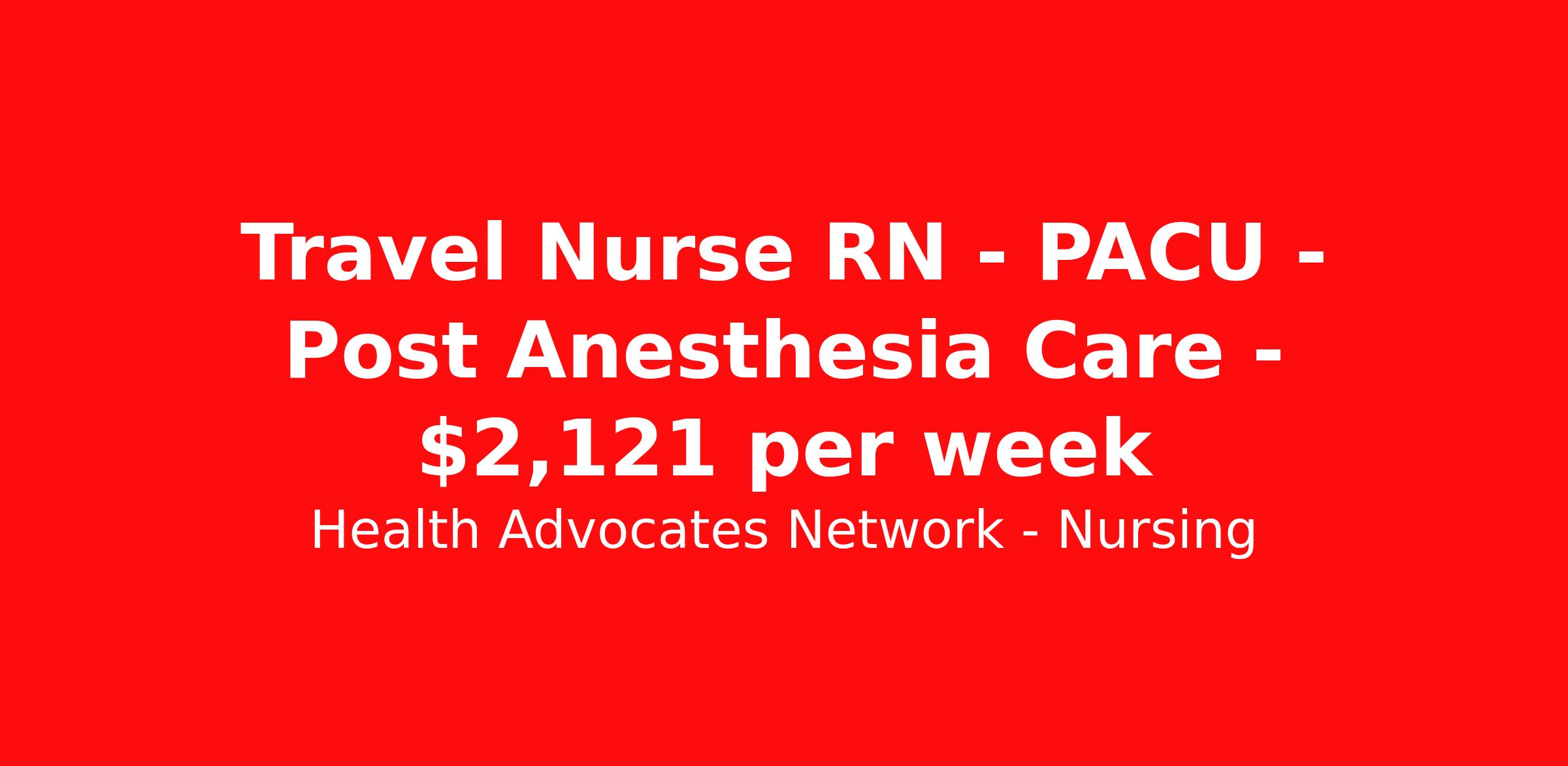 Health Advocates Network - Nursing is seeking a travel nurse RN PACU - Post Anesthesia Care for a travel nursing job in Melbourne, Florida. Job Description & Requirements Specialty: PACU - Post Anesthesia Care Discipline: RN Start Date: 04/13/2026 Duration: 13 weeks 40 hours per week Shift: 10 hours, days Employment Type: Travel RN – PACU Registered Nurse - Health Advocates Network is urgently hiring PACU RNs with at least 2 years of recent experience! IMMEDIATE STARTS! Travel package: $2,121.00 weekly Shift: 10- hour DAY shifts available 13 -week contracts available Specialty: PACU Registered Nurse (RN) Requirements: Active FL or COMPACT State Registered Nurse License Valid BLS, ACLS, NIHSS, and PALS Graduate of an Accredited School of Nursing Additional certifications may be required Level II Trauma Center experience required Expert in all areas of Neurological and Cardiovascular sections of PACU skills assesment. Benefits We Offer: Competitive pay rates, Referral Bonus, Medical, Dental, Vision, and 401k. Travel reimbursement and per diem allowances, Employee discounts, educational opportunities, and more! To apply for this job now or to find out more about other opportunities with Health Advocates Network, Inc., reply to this posting, contact us at , or call/text . We can provide you with unparalleled access to exciting career opportunities. Health Advocates Network, Inc . is an equal opportunity employer. All qualified applicants shall receive consideration for employment without regard to any legally protected basis protected by applicable federal or state law, except where a bona fide occupational qualification applies. Refer a qualified Allied Professional for a $1,000.00 bonus opportunity! HANStaff Job ID 520890. Pay package is based on 10 hour shifts and 40 hours per week (subject to confirmation) with tax-free stipend amount to be determined. Posted job title: RN - PACU About Health Advocates Network - Nursing Health Advocates Network was founded on the basis of a shared aspiration, to improve the way healthcare staffing is done. We are a company established and led by nurses. Our flexible approach enables us to develop solutions customized to your specific needs. From short- and long-term travel contracts to local and per diem assignments and more, we are here to get you to your next adventure! By solving challenges, providing the best placements, and advocating for you, we stand to help you thrive and pave the path forward in your career. Click on the videos below to learn more about our values!