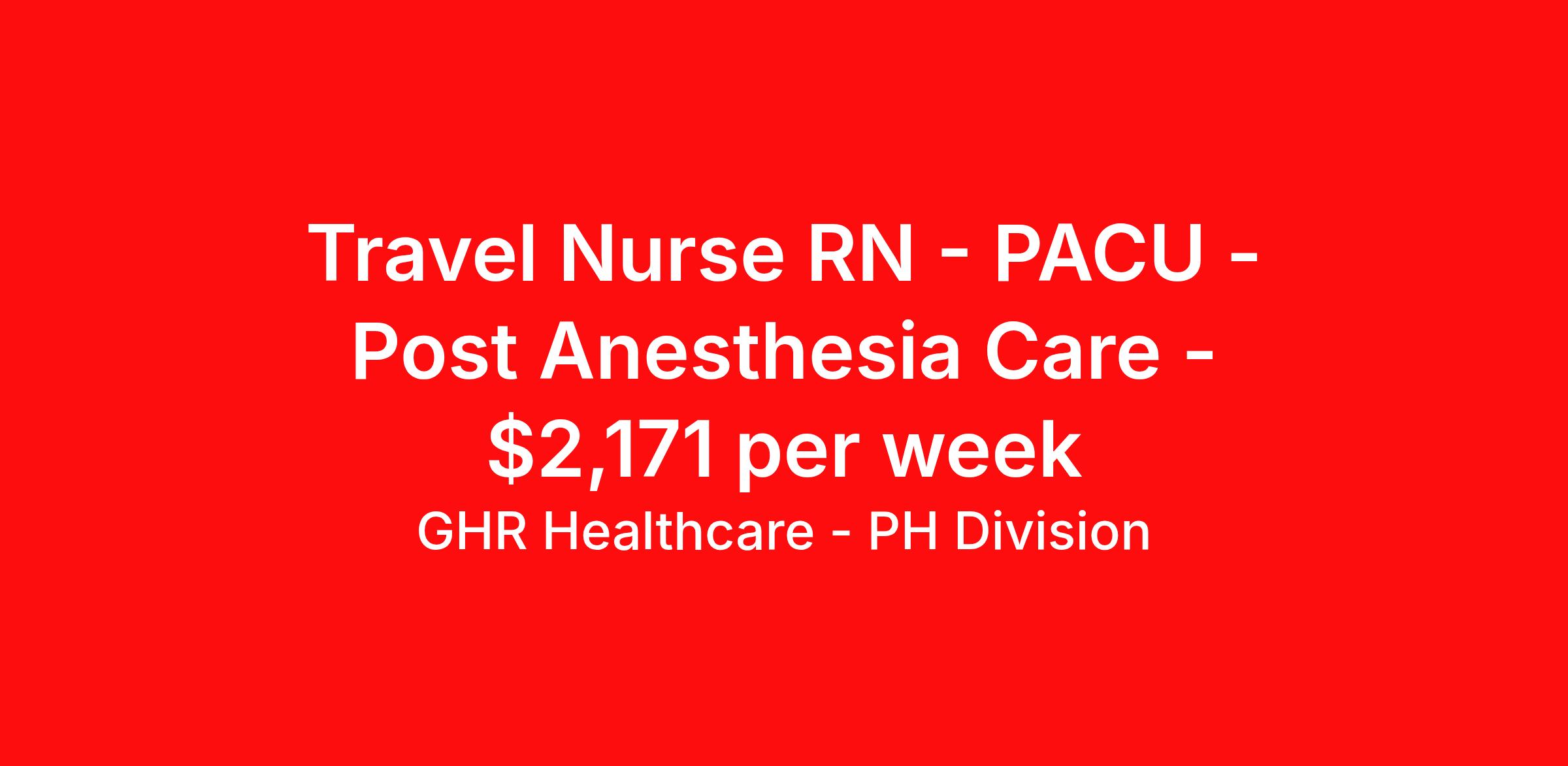 GHR Healthcare - PH Division is seeking a travel nurse RN PACU - Post Anesthesia Care for a travel nursing job in Clinton, Maryland. Job Description & Requirements Specialty: PACU - Post Anesthesia Care Discipline: RN Start Date: 04/06/2026 Duration: 13 weeks 40 hours per week Shift: 8 hours Employment Type: Travel PACU Registered Nurse (PACU RN) – Locum Tenens Travel Nursing Contract – Clinton, MD (20735) PACU Registered Nurse locum tenens travel job in Clinton, MD: 13-week locum tenens travel nursing assignment near Washington, D.C. for experienced PACU nurses with ICU/critical care skills — competitive weekly pay. Join a dynamic perioperative team as a PACU RN (Post-Anesthesia Care Unit Nurse) in Clinton, Maryland (zip code 20735). This locum tenens travel nursing opportunity places you in a supportive community hospital just outside Washington, D.C., offering excellent clinical experience, easy access to the capital, and a friendly suburban lifestyle. Ideal for PACU nurses, perioperative nurses, and travel PACU RNs seeking a short-term locum tenens contract in the Maryland/DC area. Job Details — Locum Tenens Travel PACU RN Location: Clinton, MD 20735 (Prince George's County, near Washington, D.C.) Position: PACU Registered Nurse (PACU RN) — locum tenens travel nursing contract Contract Duration: 13 weeks Start Date: March 23, 2026 End Date: June 22, 2026 Shift: 4x10-hour days (rotating shifts: 09:00–19:30, 10:00–20:30, plus evening shift 13:00–23:30 every other week) Hours per Week: 40 Estimated Weekly Pay: $1,990–$2,100 (competitive travel nursing pay) On-Call: 2–3 weekday on-call shifts (11:00pm–7:00am) and 2 weekend 24-hour calls per 6-week period Weekend Coverage: 2 weekends per 6-week contract Float: Required to float to ICU (critical care support) Qualifications & Requirements Minimum 2 years of PACU RN experience, including pediatric PACU experience ICU experience required — strong critical care skills preferred Active RN license: Maryland RN or compact state license accepted Certifications: ACLS, BLS, and PALS required Experience with Cerner electronic health record/charting system Ability to manage patient ratios of 2:1 in PACU Flu vaccine required (no exemptions) First-time travel nurses accepted — ideal travel nursing job for PACU RNs transitioning to travel Two supervisor references required Responsibilities — PACU / Post-Anesthesia Care Provide comprehensive post-anesthesia care to adolescents, adults, pediatrics, and geriatrics in the PACU Monitor and manage patient recovery in Phase I and Phase II post-anesthesia care Perform pre-operative and post-operative assessments, patient education, and discharge planning relevant to PACU care Administer and manage IVs, arterial lines, central lines, and blood products as indicated Recognize and manage dysrhythmias, pain control, respiratory complications, and other post-op complications Care for ventilated patients and perform airway management and interventions as needed Float to ICU to support critical care patient needs and collaborate with ICU teams Participate in scheduled on-call coverage and weekend shifts Collaborate with interdisciplinary teams including Physical Therapy, Respiratory Services, Radiology, and Pharmacy Maintain accurate, timely documentation using Cerner EHR Why Join This Locum Tenens PACU Travel Nursing Opportunity Work in a supportive hospital environment serving the Washington, D.C. metro area — valuable experience for perioperative and critical care nurses Competitive estimated weekly pay for travel PACU nurses Open to first-time travelers and experienced travel PACU RNs Gain experience with a variety of patient populations (pediatric to geriatric) and critical care skills Enjoy living in Clinton, MD — a friendly community with parks, shopping, and convenient access to the cultural and professional opportunities of Washington, D.C. Apply now to advance your career as a PACU Registered Nurse in this rewarding locum tenens travel nursing role! Apply now: Submit your resume and references to be considered for this PACU RN locum tenens travel contract in Clinton, MD (20735). Take the next step in your travel nursing career. Benefits 401K with Matching, Healthcare, Dental and Vision Equal Opportunity We are an equal opportunity employer and value diversity across our organization. We do not discriminate on the basis of race, religion, color, national origin, gender, sexual orientation, age, marital status, veteran status, or disability status. Planet Healthcare Job ID 463889. Pay package is based on 8 hour shifts and 40 hours per week (subject to confirmation) with tax-free stipend amount to be determined. Posted job title: PACU About GHR Healthcare - PH Division For over 30 years, GHR Healthcare has been the bridge between healthcare professionals and the facilities that need them nationwide. We're committed to uncovering your ideal fit, supported by GHR's dedication to competitive compensation, transparent communication, and a devoted team that genuinely cares about your career journey. You can trust us to stand by your side as your advocate, confidante, and partner in advancing your career. At GHR, care and consideration are at the heart of everything we do. Visit ghrhealthcare.com to learn more.