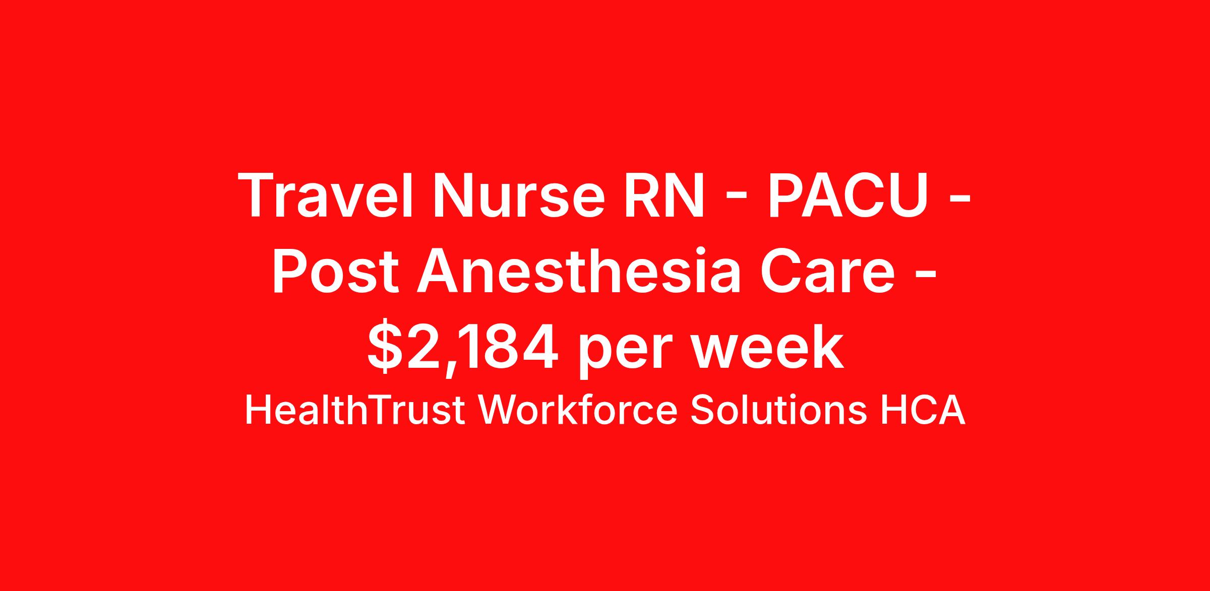 HealthTrust Workforce Solutions HCA is seeking a travel nurse RN PACU - Post Anesthesia Care for a travel nursing job in Blacksburg, Virginia. Job Description & Requirements Specialty: PACU - Post Anesthesia Care Discipline: RN Start Date: 04/13/2026 Duration: 13 weeks 36 hours per week Shift: 12 hours, days Employment Type: Travel Unit Information: Ambulatory Surgery 2nd floor Location: LewisGale Medical Center Address: 1900 Electric Rd Floor: Ambulatory Surgery Building: LewisGale Medical Center 2nd floor General Information Tell us about the unit(s): Number of Beds – 19 Ambulatory Surgery Number of Staff – 27 staff between Ambulatory Surgery and Pre Admission Testing Type of staff: RN, Tech, Secretary Patient Ratios – 1-2 on days, evenings 1-3 ratio Type of equipment – Suction, Oxygen, Vein finder, Bladder Scanner, Glucose machine, clippers, Meditech- documentation in OR module EMR – EMAR Typical hiring profile Skill Set Most recruited for: Must have : candidates without these skills will not be considered for the role. BLS Pre op and Post op experience in Ambulatory Surgery Dept., Good IV stick Preferred or nice to have : candidates with these skills will be considered first. ACLS List typical procedures performed on unit(s): Pre op patients, prep patients for surgery, post op care Pre op care of and post op care of: Interventional patients, CT bx, Open heart patients- pre op, Total joint, Choley, Urology surgeries, children- teeth and tonsillectomy surgeries, spine surgery, hysterectomy, etc… Best personality Fit: Team player, able to multi-task, quick learner, self-starter, flexible with schedule, excellent bedside manner, REQUIRED CERTIFICATIONS: BLS required, ACLS and PALS preferred Floating Area(s): Possible to assist ENDO to pre op patients- start IV’s Dress Code : Scrub Color/Attire – dark blue scrubs or white scrubs Weekends and On call: No weekends or call About HealthTrust Workforce Solutions HCA At HealthTrust Workforce Solutions, healthcare is not just about the four walls of a facility but about the people who provide and receive care. Our focus is on empowering healthcare professionals to deliver exceptional patient experiences by providing them with the necessary skills, tools, and support. We partner with healthcare facilities nationwide to ensure that the right professionals are in the right roles. We prioritize our clinicians by giving them a voice and access to opportunities to fulfill their mission of improving lives by providing quality patient care. We are committed to our core values of Trust, Innovation, Adaptability, Courage, and Accountability. We are dedicated to positively impacting the healthcare industry by providing first-priority access to more than 200,000 jobs nationwide to our healthcare professionals. Join us and be part of the HealthTrust family, where you can make a difference every day. We embrace our changing environment, and we maintain a culture that has a rich tradition of transforming itself to meet the challenges of the future. MISSION STATEMENT While putting great people in the right roles is essential, our mission is far greater. We want our clinicians to be part of the HealthTrust family, where healthcare professionals have a voice and are empowered with the right tools and opportunities to fulfill their personal mission of improving lives. Plus, as a preferred partner to thousands of top-performing hospitals, we provide our healthcare professionals with first-priority access to more than 200,000 jobs nationwide. Benefits Dental benefits Vision benefits Referral bonus Continuing Education Life insurance