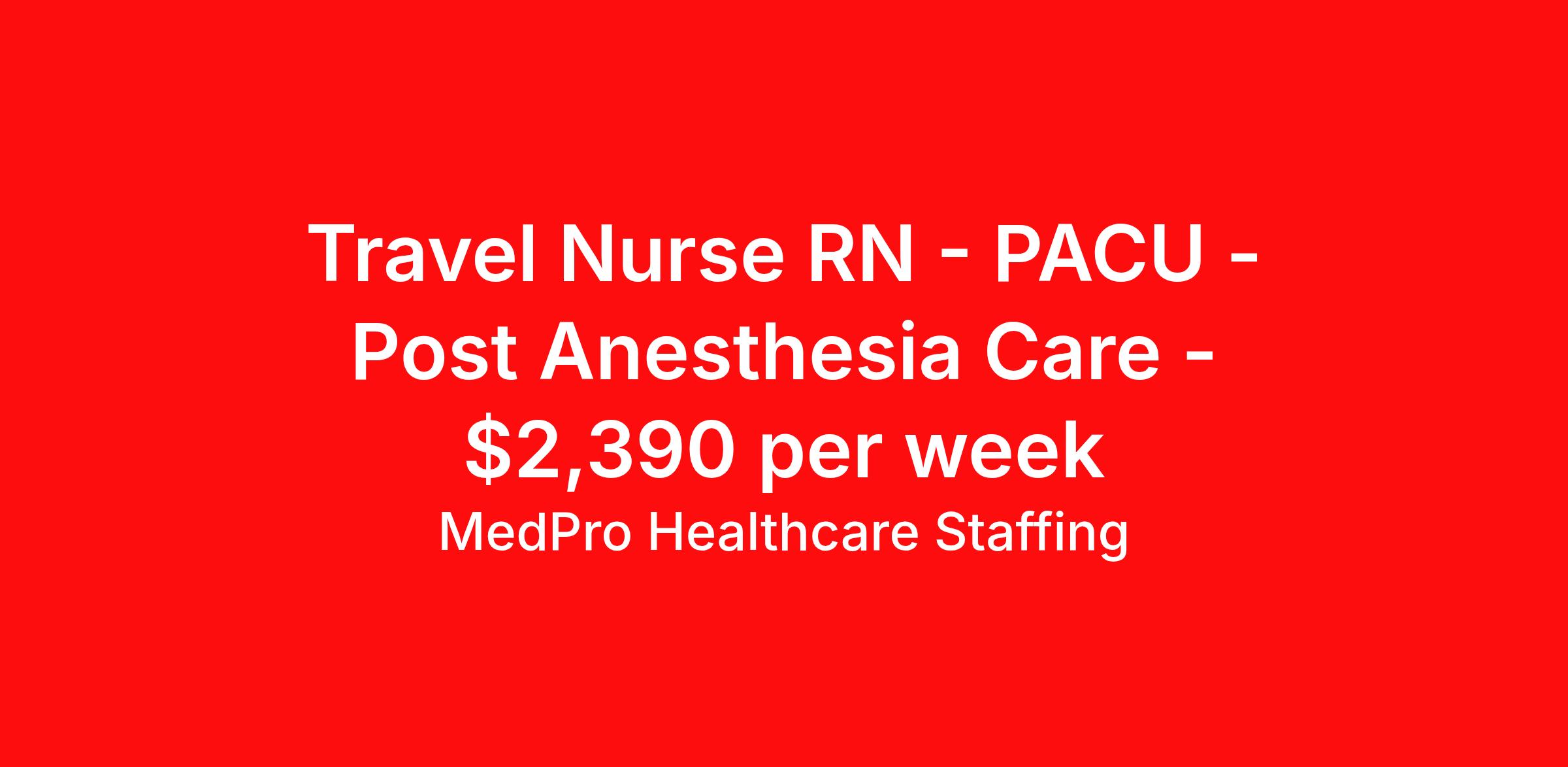 MedPro Healthcare Staffing is seeking a travel nurse RN PACU - Post Anesthesia Care for a travel nursing job in Oklahoma City, Oklahoma. Job Description & Requirements Specialty: PACU - Post Anesthesia Care Discipline: RN Start Date: 04/06/2026 Duration: 13 weeks 36 hours per week Shift: 12 hours Employment Type: Travel MedPro Healthcare Staffing , a Joint Commission-certified staffing agency, is seeking a quality PACU Registered Nurse (RN) for a travel assignment with one of our top healthcare clients. Requirements Active RN License Degree from accredited nursing program BLS, & ACLS Certifications Eighteen months of recent experience in an Acute Care PACU setting Other requirements to be determined by our client facility Benefits Weekly pay and direct deposit Full coverage of all credentialing fees Private housing or housing allowance Group Health insurance for you and your family Company-paid life and disability insurance Travel reimbursement 401(k) matching Unlimited Referral Bonuses up to $1,000 Duties Responsibilities Post Anesthesia Care Unit / PACU RN will assist in recovering the patients from anesthesia. They also monitor patients while they wake up from surgery until they are released, either by discharge to outpatient or transfer to the floor for their patient stay. Provide care for post-operative patients recovering from anesthesia, including general, regional, and local. Treats inpatients and outpatients according to their needs. Administer diligent care via monitoring, assessment, intervention, and continuous reassessment. About Agency MedPro Healthcare Staffing is a Joint Commission certified provider of contract staffing services. Since 1983, we have placed nursing and allied travelers in top healthcare facilities nationwide. Join us today for your very own MedPro Experience®. If qualified and interested, please call for immediate consideration. MedPro Staffing is an Equal Opportunity Employer. All applicants will be considered for employment without attention to race, color, religion, national origin, age, sex, disability, marital status or veteran status. Key Words: Registered Nurse, RN, Operating Room, Scrub, Circulate, OR, Contract Nurse, Travel Nurse, Agency RN, Travel RN, Nursing, Contract, Perioperative nurse *Weekly payment estimates are intended for informational purposes only and include a gross estimate of hourly wages and reimbursements for meal, incidental, and housing expenses. Your recruiter will confirm your eligibility and provide additional details. MedPro Job ID a0Fcx00000EzFlFEAV. Pay package is based on 12 hour shifts and 36 hours per week (subject to confirmation) with tax-free stipend amount to be determined. Posted job title: PACU Registered Nurse Nursing: PACU - Recovery Room. About MedPro Healthcare Staffing At MedPro Healthcare Staffing , we believe no one cares more for caregivers than we do. Our mission is simple: you focus on your patients, and we’ll take care of the rest. As a Joint Commission-certified leader in temporary and contract healthcare staffing since 1983, MedPro has proudly connected nursing and allied travelers with top healthcare facilities across the nation. With thousands of job opportunities available nationwide, we make it easy to find assignments that align with your goals and lifestyle. Our on-staff clinical support team—alongside a compassionate group of experienced recruiters—provides hands-on guidance every step of the way. From Day 1 medical benefits and a 401(k) plan to personalized career support, we’re committed to ensuring every professional we serve feels valued, cared for, and empowered to succeed. Guided by a CEO who is a Registered Nurse, MedPro is built on a foundation of clinical insight and genuine compassion for the caregiving community. Through The MedPro Experience® , we deliver travel assignments that are rewarding, memorable, and designed to help you DREAM big, EXPLORE often, and ACHIEVE greatness. Benefits Day 1 medical, dental, and vision benefits for you and your family Weekly pay and direct deposit Unlimited Referral Bonuses starting at $500 On Staff Clinical Support Team Access to nationwide travel assignments MPX Mobile app -24/7 real-time access to jobs, credentials, assignment details, and more Full coverage of all credentialing fees Private housing or housing allowance Tax Free Per Diems, Housing Stipends and Travel Reimbursements Company-paid life and disability insurance Travel reimbursement 401(k) matching Benefits Weekly pay Referral bonus Employee assistance programs
