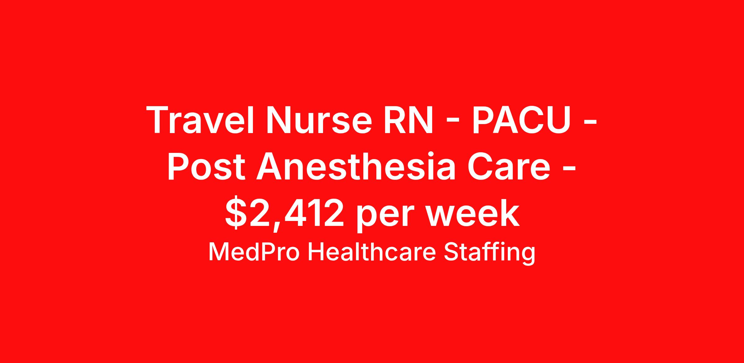 MedPro Healthcare Staffing is seeking a travel nurse RN PACU - Post Anesthesia Care for a travel nursing job in Lebanon, New Hampshire. Job Description & Requirements Specialty: PACU - Post Anesthesia Care Discipline: RN Start Date: 04/06/2026 Duration: 13 weeks 36 hours per week Shift: 12 hours, days Employment Type: Travel MedPro Healthcare Staffing , a Joint Commission-certified staffing agency, is seeking a quality PACU Registered Nurse (RN) for a travel assignment with one of our top healthcare clients. Requirements Active RN License Degree from accredited nursing program BLS, & ACLS Certifications Eighteen months of recent experience in an Acute Care PACU setting Other requirements to be determined by our client facility Benefits Weekly pay and direct deposit Full coverage of all credentialing fees Private housing or housing allowance Group Health insurance for you and your family Company-paid life and disability insurance Travel reimbursement 401(k) matching Unlimited Referral Bonuses up to $1,000 Duties Responsibilities Post Anesthesia Care Unit / PACU RN will assist in recovering the patients from anesthesia. They also monitor patients while they wake up from surgery until they are released, either by discharge to outpatient or transfer to the floor for their patient stay. Provide care for post-operative patients recovering from anesthesia, including general, regional, and local. Treats inpatients and outpatients according to their needs. Administer diligent care via monitoring, assessment, intervention, and continuous reassessment. About Agency MedPro Healthcare Staffing is a Joint Commission certified provider of contract staffing services. Since 1983, we have placed nursing and allied travelers in top healthcare facilities nationwide. Join us today for your very own MedPro Experience®. If qualified and interested, please call for immediate consideration. MedPro Staffing is an Equal Opportunity Employer. All applicants will be considered for employment without attention to race, color, religion, national origin, age, sex, disability, marital status or veteran status. Key Words: Registered Nurse, RN, Operating Room, Scrub, Circulate, OR, Contract Nurse, Travel Nurse, Agency RN, Travel RN, Nursing, Contract, Perioperative nurse *Weekly payment estimates are intended for informational purposes only and include a gross estimate of hourly wages and reimbursements for meal, incidental, and housing expenses. Your recruiter will confirm your eligibility and provide additional details. MedPro Job ID a0Fcx00000HEHC6EAP. Pay package is based on 12 hour shifts and 36 hours per week (subject to confirmation) with tax-free stipend amount to be determined. Posted job title: PACU Registered Nurse Nursing: PACU - Recovery Room. About MedPro Healthcare Staffing At MedPro Healthcare Staffing , we believe no one cares more for caregivers than we do. Our mission is simple: you focus on your patients, and we’ll take care of the rest. As a Joint Commission-certified leader in temporary and contract healthcare staffing since 1983, MedPro has proudly connected nursing and allied travelers with top healthcare facilities across the nation. With thousands of job opportunities available nationwide, we make it easy to find assignments that align with your goals and lifestyle. Our on-staff clinical support team—alongside a compassionate group of experienced recruiters—provides hands-on guidance every step of the way. From Day 1 medical benefits and a 401(k) plan to personalized career support, we’re committed to ensuring every professional we serve feels valued, cared for, and empowered to succeed. Guided by a CEO who is a Registered Nurse, MedPro is built on a foundation of clinical insight and genuine compassion for the caregiving community. Through The MedPro Experience® , we deliver travel assignments that are rewarding, memorable, and designed to help you DREAM big, EXPLORE often, and ACHIEVE greatness. Benefits Day 1 medical, dental, and vision benefits for you and your family Weekly pay and direct deposit Unlimited Referral Bonuses starting at $500 On Staff Clinical Support Team Access to nationwide travel assignments MPX Mobile app -24/7 real-time access to jobs, credentials, assignment details, and more Full coverage of all credentialing fees Private housing or housing allowance Tax Free Per Diems, Housing Stipends and Travel Reimbursements Company-paid life and disability insurance Travel reimbursement 401(k) matching Benefits Weekly pay Referral bonus Employee assistance programs