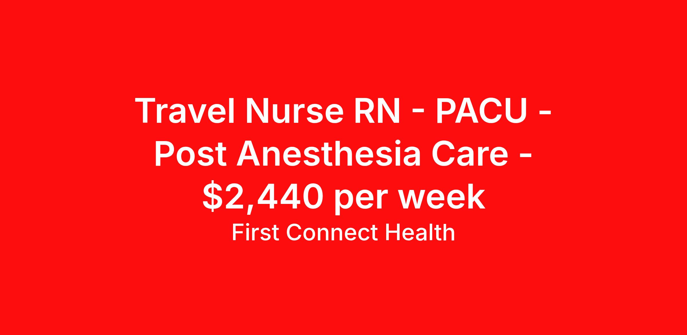 First Connect Health is seeking a travel nurse RN PACU - Post Anesthesia Care for a travel nursing job in Boston, Massachusetts. Job Description & Requirements Specialty: PACU - Post Anesthesia Care Discipline: RN Start Date: 04/13/2026 Duration: 13 weeks 36 hours per week Shift: 12 hours, nights Employment Type: Travel Description Title: PACU RN Location: Boston, MA Duration: 13 Weeks Shift: Nights Requirements: 3 years of exp. required. BLS Required. MA RN license required About First Connect Health At First Connect Health , we take pride in being a Joint Commission–certified healthcare staffing agency , headquartered in Newark, New Jersey. This prestigious certification is more than just a seal — it's a reflection of our commitment to excellence, safety, and quality in everything we do. By meeting the rigorous standards set by The Joint Commission, one of the most respected accrediting bodies in healthcare, we've demonstrated that our processes, compliance, and patient care standards are aligned with the highest levels of quality in the industry. But our dedication goes beyond certifications. Nurses choose First Connect Health because: ✅ Trust and Transparency: We foster honest communication, timely updates, and full transparency throughout your placement journey. ✅ Best Pay & Benefits: We offer industry-leading compensation packages, along with benefits that support your career goals. ✅ Flexibility & Choice: Whether you're seeking short-term assignments, long-term contracts, or local opportunities, we provide the flexibility to suit your preferences. ✅ Personalized Support: Our recruiters take the time to understand your needs, guiding you with care, respect, and responsiveness at every step. When you work with First Connect Health, you're not just another number — you're a valued professional. Join a team that’s focused on your success, your well-being, and your future in healthcare. Benefits Medical benefits Sick pay 401k retirement plan Weekly pay Referral bonus
