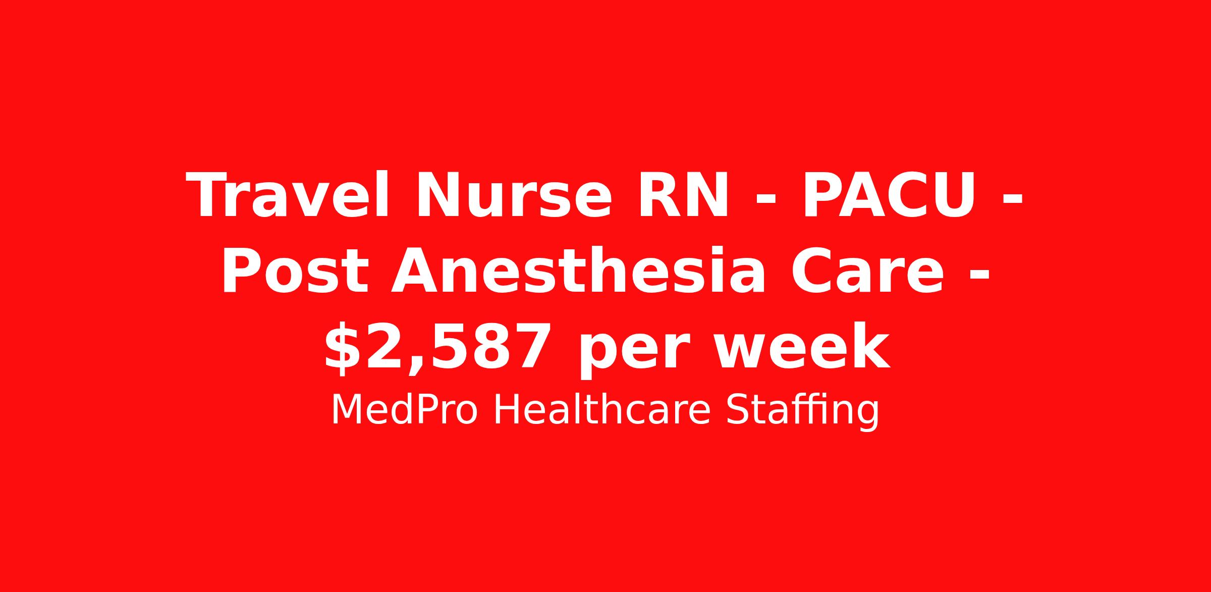 MedPro Healthcare Staffing is seeking a travel nurse RN PACU - Post Anesthesia Care for a travel nursing job in Manchester, Connecticut. Job Description & Requirements Specialty: PACU - Post Anesthesia Care Discipline: RN Start Date: 04/06/2026 Duration: 13 weeks 40 hours per week Shift: 8 hours, evenings Employment Type: Travel MedPro Healthcare Staffing , a Joint Commission-certified staffing agency, is seeking a quality PACU Registered Nurse (RN) for a travel assignment with one of our top healthcare clients. Requirements Active RN License Degree from accredited nursing program BLS, & ACLS Certifications Eighteen months of recent experience in an Acute Care PACU setting Other requirements to be determined by our client facility Benefits Weekly pay and direct deposit Full coverage of all credentialing fees Private housing or housing allowance Group Health insurance for you and your family Company-paid life and disability insurance Travel reimbursement 401(k) matching Unlimited Referral Bonuses up to $1,000 Duties Responsibilities Post Anesthesia Care Unit / PACU RN will assist in recovering the patients from anesthesia. They also monitor patients while they wake up from surgery until they are released, either by discharge to outpatient or transfer to the floor for their patient stay. Provide care for post-operative patients recovering from anesthesia, including general, regional, and local. Treats inpatients and outpatients according to their needs. Administer diligent care via monitoring, assessment, intervention, and continuous reassessment. About Agency MedPro Healthcare Staffing is a Joint Commission certified provider of contract staffing services. Since 1983, we have placed nursing and allied travelers in top healthcare facilities nationwide. Join us today for your very own MedPro Experience®. If qualified and interested, please call for immediate consideration. MedPro Staffing is an Equal Opportunity Employer. All applicants will be considered for employment without attention to race, color, religion, national origin, age, sex, disability, marital status or veteran status. Key Words: Registered Nurse, RN, Operating Room, Scrub, Circulate, OR, Contract Nurse, Travel Nurse, Agency RN, Travel RN, Nursing, Contract, Perioperative nurse *Weekly payment estimates are intended for informational purposes only and include a gross estimate of hourly wages and reimbursements for meal, incidental, and housing expenses. Your recruiter will confirm your eligibility and provide additional details. MedPro Job ID a0Fcx00000HsDePEAV. Pay package is based on 8 hour shifts and 40 hours per week (subject to confirmation) with tax-free stipend amount to be determined. Posted job title: PACU Registered Nurse Nursing: PACU - Recovery Room. About MedPro Healthcare Staffing At MedPro Healthcare Staffing , we believe no one cares more for caregivers than we do. Our mission is simple: you focus on your patients, and we’ll take care of the rest. As a Joint Commission-certified leader in temporary and contract healthcare staffing since 1983, MedPro has proudly connected nursing and allied travelers with top healthcare facilities across the nation. With thousands of job opportunities available nationwide, we make it easy to find assignments that align with your goals and lifestyle. Our on-staff clinical support team—alongside a compassionate group of experienced recruiters—provides hands-on guidance every step of the way. From Day 1 medical benefits and a 401(k) plan to personalized career support, we’re committed to ensuring every professional we serve feels valued, cared for, and empowered to succeed. Guided by a CEO who is a Registered Nurse, MedPro is built on a foundation of clinical insight and genuine compassion for the caregiving community. Through The MedPro Experience® , we deliver travel assignments that are rewarding, memorable, and designed to help you DREAM big, EXPLORE often, and ACHIEVE greatness. Benefits Day 1 medical, dental, and vision benefits for you and your family Weekly pay and direct deposit Unlimited Referral Bonuses starting at $500 On Staff Clinical Support Team Access to nationwide travel assignments MPX Mobile app -24/7 real-time access to jobs, credentials, assignment details, and more Full coverage of all credentialing fees Private housing or housing allowance Tax Free Per Diems, Housing Stipends and Travel Reimbursements Company-paid life and disability insurance Travel reimbursement 401(k) matching Benefits Weekly pay Referral bonus Employee assistance programs