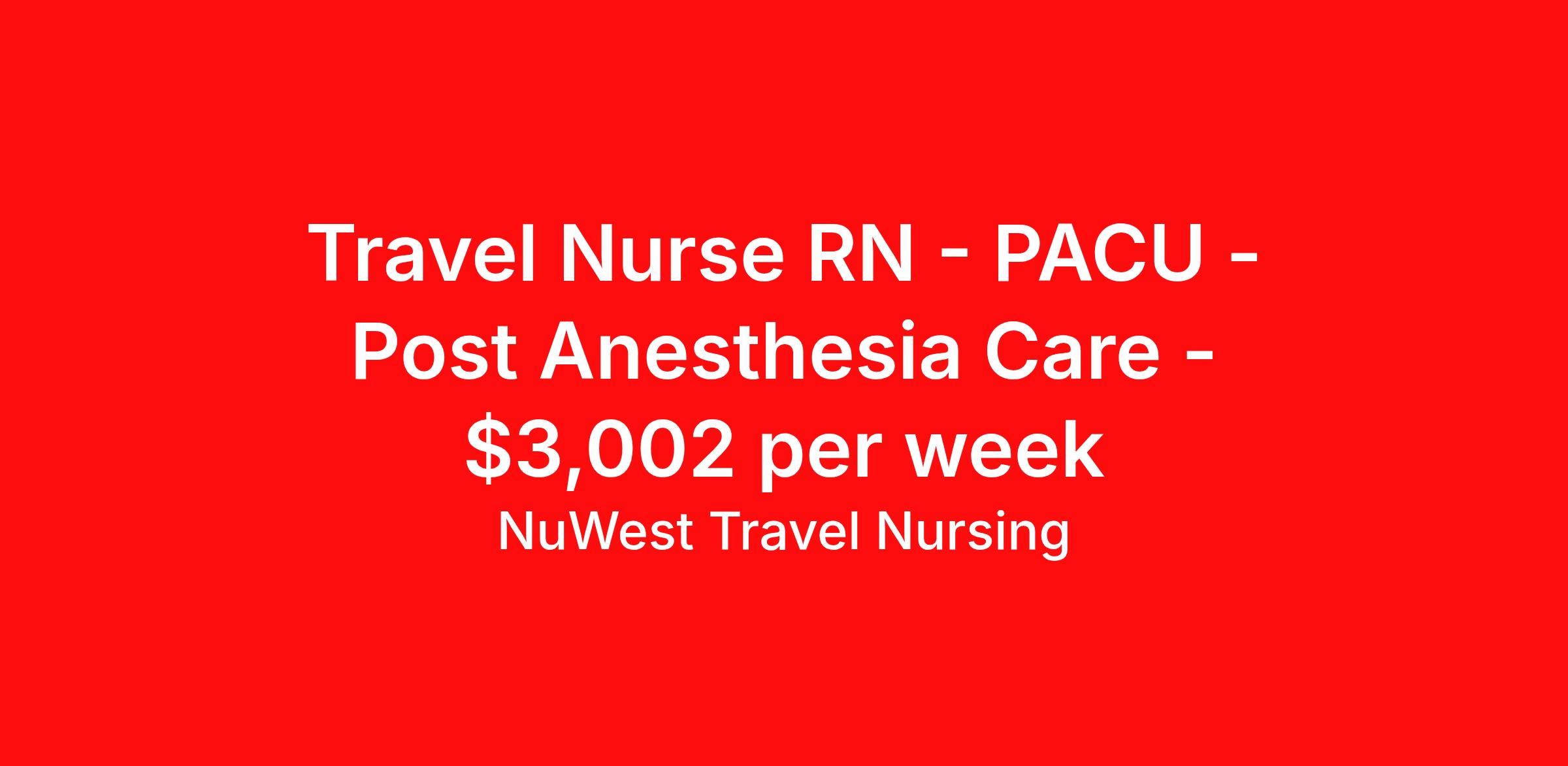 NuWest Travel Nursing is seeking a travel nurse RN PACU - Post Anesthesia Care for a travel nursing job in Los Angeles, California. Job Description & Requirements Specialty: PACU - Post Anesthesia Care Discipline: RN Start Date: 03/26/2026 Duration: 8 weeks 40 hours per week Shift: 10 hours, days Employment Type: Travel 4x10s - 3 openings Must have CA license 2 years of experience