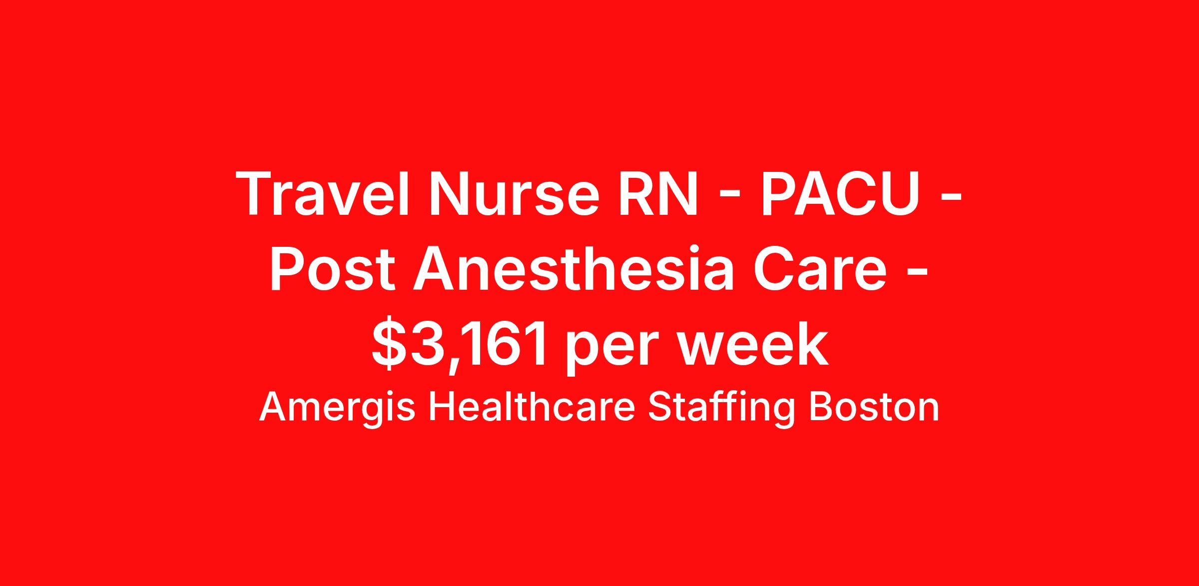 Amergis Healthcare Staffing Boston is seeking a travel nurse RN PACU - Post Anesthesia Care for a travel nursing job in Hyannis, Massachusetts. Job Description & Requirements Specialty: PACU - Post Anesthesia Care Discipline: RN Duration: 13 weeks 40 hours per week Shift: 8 hours, days, evenings Employment Type: Travel Rotating start times - 11a-7p, 1p-7p, 3p-11p. No weekends, No holidays, No call Amergis Healthcare Staffing Boston Job ID 1095095. Pay package is based on 8 hour shifts and 40 hours per week (subject to confirmation) with tax-free stipend amount to be determined. About Amergis Healthcare Staffing Boston Amergis, formerly known as Maxim Healthcare Staffing, has served our clients and communities by connecting people to the work that matters since 1988. We provide meaningful opportunities to our extensive network of healthcare and school-based professionals, ready to work in any hospital, government facility, or school. Through partnership and innovation, Amergis creates unmatched staffing experiences to deliver the best workforce solutions. Benefits Referral bonus