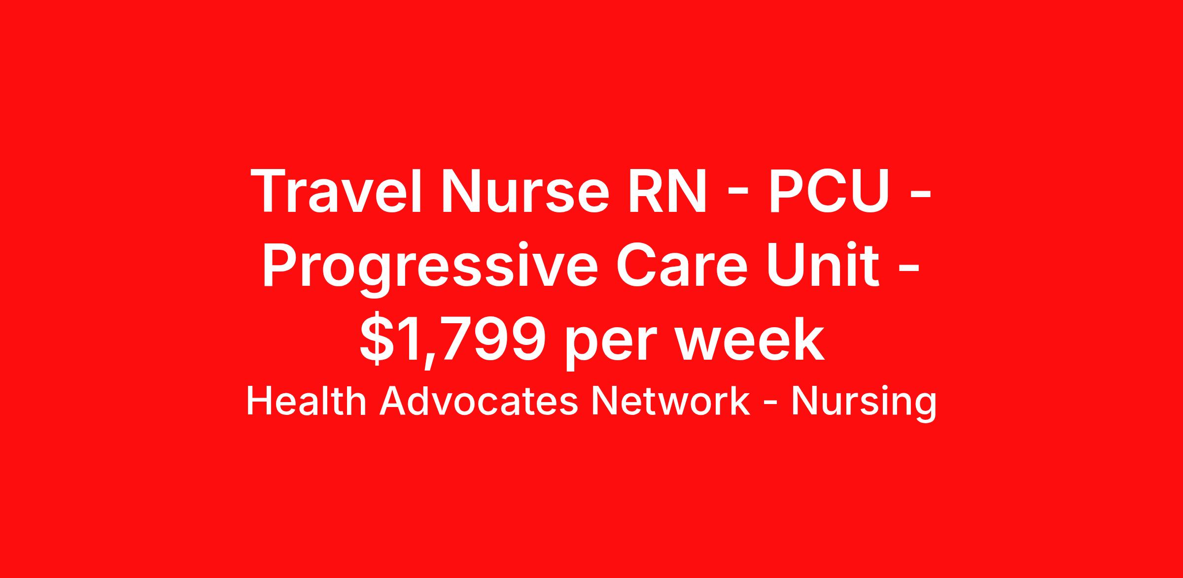 Health Advocates Network - Nursing is seeking a travel nurse RN PCU - Progressive Care Unit for a travel nursing job in Bowling Green, Kentucky. Job Description & Requirements Specialty: PCU - Progressive Care Unit Discipline: RN Start Date: ASAP Duration: 13 weeks 36 hours per week Shift: 12 hours, nights Employment Type: Travel Health Advocates Network is urgently hiring PCU Registered Nurses (RNs) in the Bowling Green, KY area. Must have 1 year of PCU experience. Pay Rate: $1,799 weekly Specialty: PCU Registered Nurse (RN) Shift: Night 13 Week Contracts and more available! Qualification and Requirements: Authorized to work in the United States. Graduate of an Accredited School of Nursing 1 year of experience as a PCU Registered Nurse (RN) American Heart Association BLS An active, current (KY) state license Apply for this job now or to find out more about other opportunities with Health Advocates Network, Inc. reply to this posting, contact us at or call/text . We can provide you unparalleled access to exciting career opportunities. Benefits We Offer: Competitive pay rates, Referral Bonus, Medical, Dental, Vision and 401k. Travel reimbursement and per diem allowances, Employee discounts, educational opportunities, and more! Who We Are: Health Advocates Network matches highly skilled applicants to positions at the best healthcare companies on a temporary and temporary-to-hire basis. Our mission is to provide you with a rewarding job that is well-matched to your skills – helping you advance in your career. Our experience, combined with our client relationships, makes Health Advocates Network a great resource for your career. Health Advocates Network, Inc. is an equal-opportunity employer. All qualified applicants shall receive consideration for employment without regard to any legally protected basis protected by applicable federal or state law except where a bona fide occupational qualification applies. Refer a Registered Nurse for a $1000.00 bonus opportunity! HANStaff Job ID 519364. Pay package is based on 12 hour shifts and 36 hours per week (subject to confirmation) with tax-free stipend amount to be determined. Posted job title: RN - PCU About Health Advocates Network - Nursing Health Advocates Network was founded on the basis of a shared aspiration, to improve the way healthcare staffing is done. We are a company established and led by nurses. Our flexible approach enables us to develop solutions customized to your specific needs. From short- and long-term travel contracts to local and per diem assignments and more, we are here to get you to your next adventure! By solving challenges, providing the best placements, and advocating for you, we stand to help you thrive and pave the path forward in your career. Click on the videos below to learn more about our values!