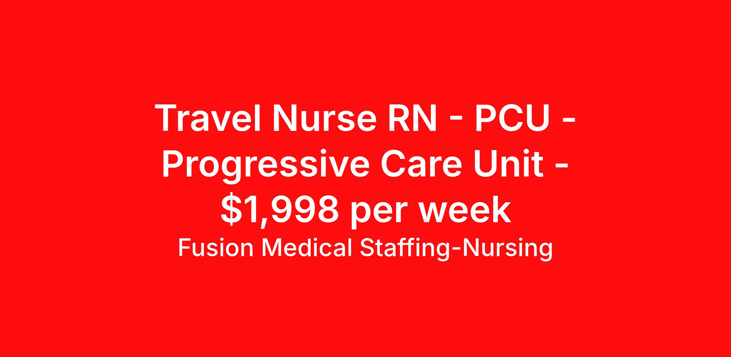 Fusion Medical Staffing-Nursing is seeking a travel nurse RN PCU - Progressive Care Unit for a travel nursing job in Chicago, Illinois. Job Description & Requirements Specialty: PCU - Progressive Care Unit Discipline: RN Start Date: 04/06/2026 Duration: 13 weeks 36 hours per week Shift: 12 hours, nights Employment Type: Travel Travel Stepdown RN Company: Fusion Medical Staffing Location: Facility in Chicago, Illinois Job Details Fusion Medical Staffing is seeking a skilled Stepdown RN for a 13-week travel assignment in Chicago, Illinois. As a member of our team, you'll have the opportunity to make a positive impact on the lives of patients while enjoying competitive pay, comprehensive benefits, and the support of a dedicated clinical team. Required Qualifications: One year of recent experience as a Stepdown RN Current Valid RN license in compliance with state regulations Current BLS Certification (AHA/ARC) Current ACLS Certification (AHA/ARC) Preferred Qualifications: Progressive Care Certified Nurse (PCCN) Certification NIHSS Certification Other certifications and licenses may be required for this position Summary: A Stepdown Registered Nurse provides care to patients who are transitioning from intensive care to medical-surgical or general inpatient units. These patients require frequent monitoring and specialized nursing interventions. They assess and manage complex patient needs, administer medications and treatments, and collaborate with multidisciplinary teams to ensure safe, patient-centered care. Essential Work Functions: Monitors and interprets cardiac rhythms, vital signs, and other telemetry data to detect abnormalities and respond appropriately Administers prescribed medications and treatments in accordance with approved nursing techniques, with a focus on cardiac care Prepares equipment and aids physician during cardiac-related procedures and examinations Maintains awareness of comfort and safety needs of telemetry patients Observes patient, records significant conditions and reactions, and notifies supervisor or physician of patient's cardiac status and response to interventions Responds to life-saving situations based upon nursing standards, policies, procedures, and protocols specific to cardiac emergencies Documents nursing history and physical assessment for assigned telemetry patients Initiates patient education plans according to individualized needs, focusing on cardiac health, risk factors, and lifestyle modifications Collaborates with the interdisciplinary team to ensure comprehensive care for telemetry patients Maintains confidentiality of patients and client Performs other duties as assigned within the scope of practice Adheres to hospital safety protocols, infection control guidelines, and regulatory standards Required Essential Skills: Critical thinking, service excellence, and good interpersonal communication skills The ability to read, write, and communicate in the English language Ability to read/comprehend written instructions, follow verbal instructions, and proficiency in PC skills Physical Abilities - Must be able to remain in a stationary position, move about, move equipment (50-100lbs), push, pull, and bend Interpersonal Skills - Must be able to work effectively with a variety of personnel (professional and ancillary) to present a positive attitude and professionalism Technical/Motor Skills - Must have the ability to grasp, perform fine manipulation, push/pull, and move about when assisting with procedures and/or using department equipment Mental Requirements - Must be able to cope with frequent contact with the general public and customers while meeting deadlines under pressure. Must be able to work under close supervision occasionally, as well as working without assistance from other personnel. Must be able to contend with irregular activity schedules occasionally and continuous concentration to detail Sensory - Must possess visual acuity and ability to effectively communicate Benefits Include: Highly competitive pay for travel professionals Comprehensive medical, dental, and vision insurance with first day coverage Paid Time Off (PTO) after 1560 hours Life and Short-term disability offered 401(k) matching Aggressive Refer-a-friend Bonus Program 24/7 recruiter support Reimbursement for licensure and CEUs Why Choose Fusion? At Fusion Medical Staffing, our goal is to improve the lives of everyone we touch, and we're always looking for people like you to join our mission. Your passion for helping others deserves a partner just as committed to supporting you — that’s why we offer day one insurance, $0 copay for mental health services, scholarships and awards, exclusive discounts, and more. From your personal recruiter to our clinical and traveler experience teams, we’re here to guide and celebrate you along your journey. You take care of others; we take care of you. Other Duties Disclaimer: To perform this job successfully, an individual must be able to perform each essential duty satisfactorily. The requirements listed are representative of the knowledge, skill, and/or ability required. Reasonable accommodations may be made to enable individuals with disabilities to perform the essential functions. Other duties may be assigned. This job description is not a comprehensive list of all activities, duties, or responsibilities that are required of the employee for this job and is subject to change at any time with or without notice. Start your rewarding career as a Stepdown RN with Fusion Medical Staffing and join our mission to improve lives. Apply now! *Fusion is an EOE/E-Verify Employer Fusion Medical Staffing - Nursing Job ID 1888075. Pay package is based on 12 hour shifts and 36 hours per week (subject to confirmation) with tax-free stipend amount to be determined. About Fusion Medical Staffing-Nursing With a mission to improve the lives of everyone we touch, Fusion Medical Staffing connects healthcare travelers to opportunities in the locations th