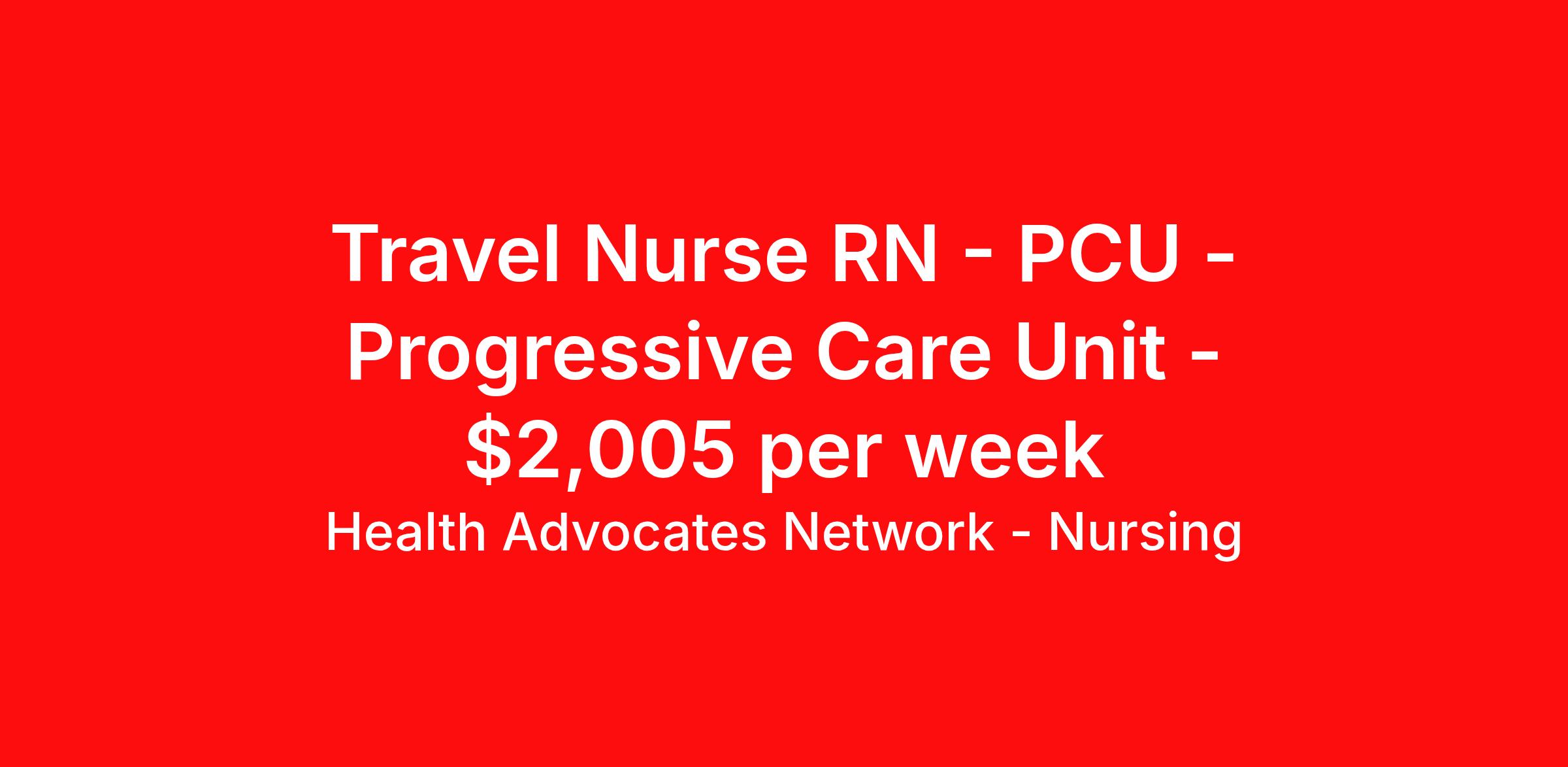 Health Advocates Network - Nursing is seeking a travel nurse RN PCU - Progressive Care Unit for a travel nursing job in Fort Smith, Arkansas. Job Description & Requirements Specialty: PCU - Progressive Care Unit Discipline: RN Start Date: 03/30/2026 Duration: 13 weeks 36 hours per week Shift: 12 hours, nights Employment Type: Travel RN – PCU Registered Nurse - Health Advocates Network is urgently hiring PCU RNs with at least 2 years of recent experience! IMMEDIATE STARTS! Travel packages up to $2,005 weekly 12HR NIGHT shifts available 13 week contracts available Specialty: PCU Registered Nurse (RN) Requirements: Active AR State or Compact Registered Nurse License if applicable BLS, ACLS, NIHSS Graduate of an Accredited School of Nursing Additional certifications may be required Benefits We Offer: Competitive pay rates, Referral Bonus, Medical, Dental and Vision. Travel reimbursement and per diem allowances, Employee discounts, educational opportunities, and more! To apply for this job now or to find out more about other opportunities with Health Advocates Network, Inc. reply to this posting, contact us at or call/text . We can provide you unparalleled access to exciting career opportunities. Health Advocates Network, Inc . is an equal opportunity employer. All qualified applicants shall receive consideration for employment without regard to any legally protected basis protected by applicable federal or state law except where a bona fide occupational qualification applies. Refer a Registered Nurse for a $1,000.00 bonus opportunity! HANStaff Job ID 520979. Pay package is based on 12 hour shifts and 36 hours per week (subject to confirmation) with tax-free stipend amount to be determined. Posted job title: RN - PCU About Health Advocates Network - Nursing Health Advocates Network was founded on the basis of a shared aspiration, to improve the way healthcare staffing is done. We are a company established and led by nurses. Our flexible approach enables us to develop solutions customized to your specific needs. From short- and long-term travel contracts to local and per diem assignments and more, we are here to get you to your next adventure! By solving challenges, providing the best placements, and advocating for you, we stand to help you thrive and pave the path forward in your career. Click on the videos below to learn more about our values!