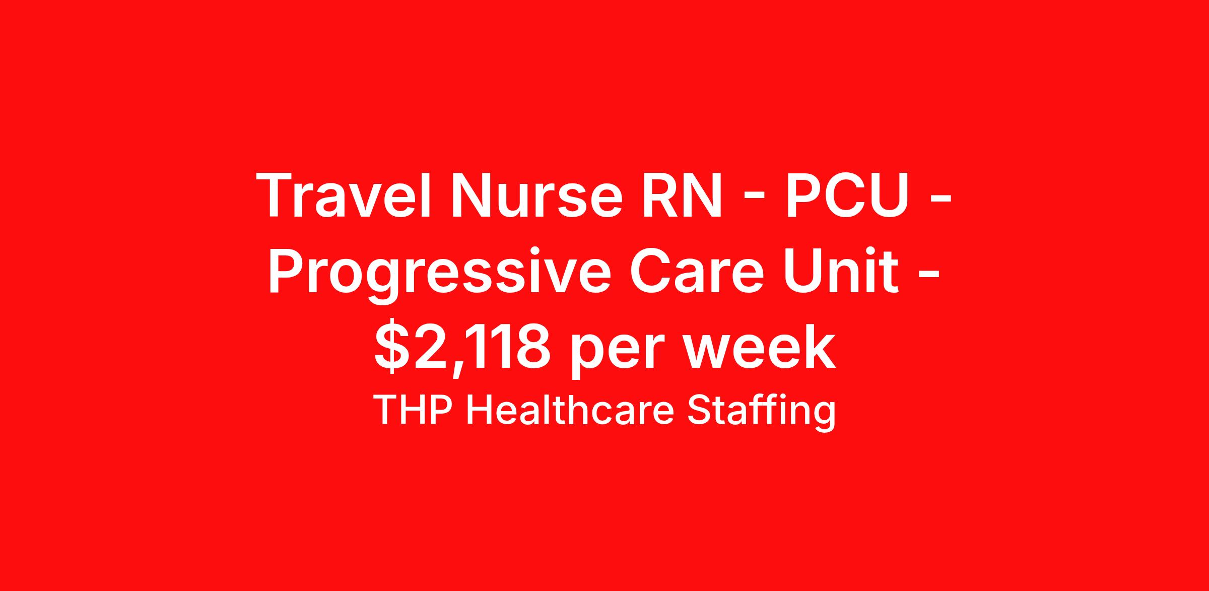 THP Healthcare Staffing is seeking a travel nurse RN PCU - Progressive Care Unit for a travel nursing job in Goldsboro, North Carolina. Job Description & Requirements Specialty: PCU - Progressive Care Unit Discipline: RN Start Date: 04/13/2026 Duration: 13 weeks 36 hours per week Shift: 12 hours, nights Employment Type: Travel Our Client is currently seeking RN - PCU positions in Goldsboro, NC for a 3x12 Nights shift. You must have current State Licensure and at least 1 year of recent experience. Requirements Current Resume State Licensure Current BLS and/or ACLS and/or Specialty Certifications 2 Current Clinical References Physical (Within 12 Months) TB Skin Test (Within 12 Months) Titers - MMR/Hep B/Varicella Respiratory Fit Test (Within 12 Months) Current - Tdap/Flu Vaccinations Must be able to pass pre-employment, background and urine drug screening Compensation and Benefits Compettive Pay Packages Health Benefit Package Travel pay - 1st pay check Extending Contract Bonus Refer a friend and earn extra cash! At THP Healthcare Staffing, we take care of you - work with us, not for us! THP Healthcare Staffing Job ID 17996860. Pay package is based on 12 hour shifts and 36.0 hours per week (subject to confirmation) with tax-free stipend amount to be determined. Posted job title: RN:PCU,19:00:00-07:00:00 About THP Healthcare Staffing At THP Staffing, we specialize in connecting healthcare facilities with highly skilled travel nurses and allied health professionals who bring exceptional care and expertise wherever they go. Our mission is to ensure that every healthcare provider has access to top nursing talent, regardless of location, to deliver superior patient outcomes. Benefits Weekly pay Life insurance Pet insurance License and certification reimbursement Medical benefits Employee assistance programs Referral bonus Vision benefits Holiday Pay Health savings account