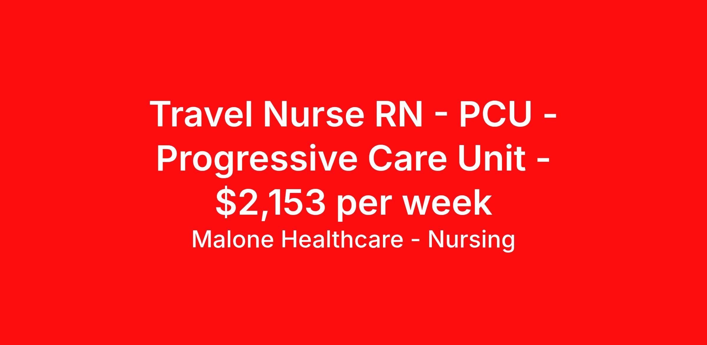 Malone Healthcare - Nursing is seeking a travel nurse RN PCU - Progressive Care Unit for a travel nursing job in Lexington, Kentucky. Job Description & Requirements Specialty: PCU - Progressive Care Unit Discipline: RN Start Date: 04/08/2026 Duration: 13 weeks 36 hours per week Shift: 12 hours, nights Employment Type: Travel About Malone Healthcare - Nursing With a commitment to providing a higher standard of service and experience in patient care, Malone Healthcare places expert nurses and allied health professionals in rewarding careers throughout the United States. As a leading healthcare staffing agency, Malone’s focus on compliance and integrity translates to a seamless experience for our team members and partner facilities. When you work with Malone Healthcare, you can rely on over 50 years of proven experience placing exceptional professionals in quality healthcare settings. Benefits Weekly pay Holiday Pay Guaranteed Hours Continuing Education 401k retirement plan Pet insurance Referral bonus Medical benefits Dental benefits Vision benefits License and certification reimbursement Life insurance