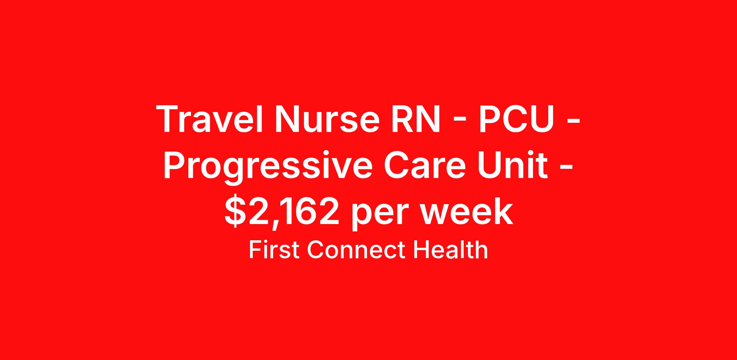 First Connect Health is seeking a travel nurse RN PCU - Progressive Care Unit for a travel nursing job in Indianapolis, Indiana. Job Description & Requirements Specialty: PCU - Progressive Care Unit Discipline: RN Start Date: 04/14/2026 Duration: 13 weeks 36 hours per week Shift: 12 hours, nights Employment Type: Travel Requirements: 2 years of experience. ACLS BLS Compact State or IN State License required About First Connect Health At First Connect Health , we take pride in being a Joint Commission–certified healthcare staffing agency , headquartered in Newark, New Jersey. This prestigious certification is more than just a seal — it's a reflection of our commitment to excellence, safety, and quality in everything we do. By meeting the rigorous standards set by The Joint Commission, one of the most respected accrediting bodies in healthcare, we've demonstrated that our processes, compliance, and patient care standards are aligned with the highest levels of quality in the industry. But our dedication goes beyond certifications. Nurses choose First Connect Health because: ✅ Trust and Transparency: We foster honest communication, timely updates, and full transparency throughout your placement journey. ✅ Best Pay & Benefits: We offer industry-leading compensation packages, along with benefits that support your career goals. ✅ Flexibility & Choice: Whether you're seeking short-term assignments, long-term contracts, or local opportunities, we provide the flexibility to suit your preferences. ✅ Personalized Support: Our recruiters take the time to understand your needs, guiding you with care, respect, and responsiveness at every step. When you work with First Connect Health, you're not just another number — you're a valued professional. Join a team that’s focused on your success, your well-being, and your future in healthcare. Benefits Medical benefits Sick pay 401k retirement plan Weekly pay Referral bonus