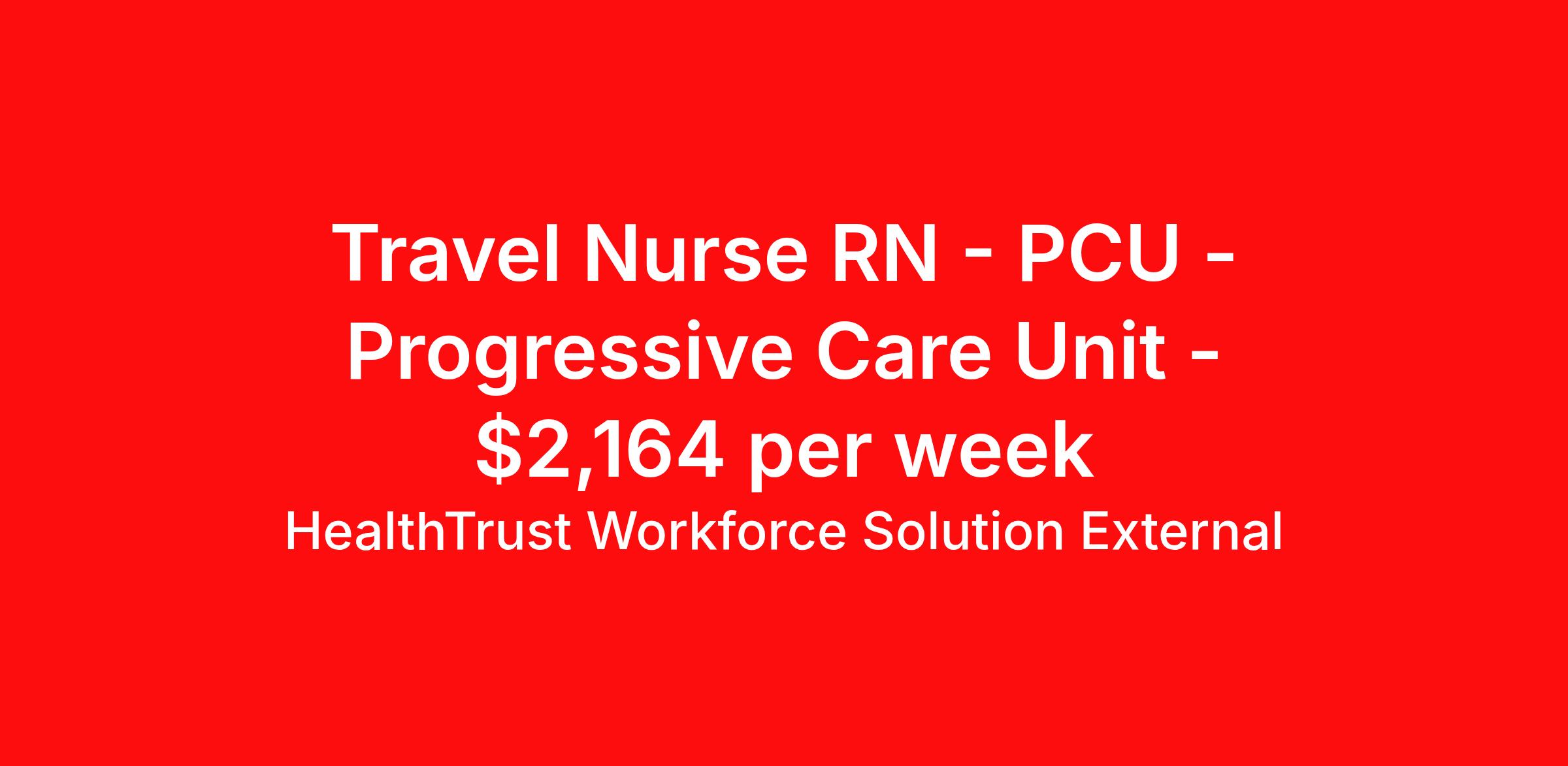 HealthTrust Workforce Solution External is seeking a travel nurse RN PCU - Progressive Care Unit for a travel nursing job in Natchez, Mississippi. Job Description & Requirements Specialty: PCU - Progressive Care Unit Discipline: RN Duration: 13 weeks 36 hours per week Shift: 12 hours, nights Employment Type: Travel JA3 Merit Health Natchez Travel PCU RN Duration: 13 weeks Shift: Nights (6:45pm-7:15am) Requirements: BLS, ACLS PALS (can obtain PALS within 1st 3 weeks of arrival to facility), perm address 50mi from facility Royal blue scrubs; max ratio 5:1