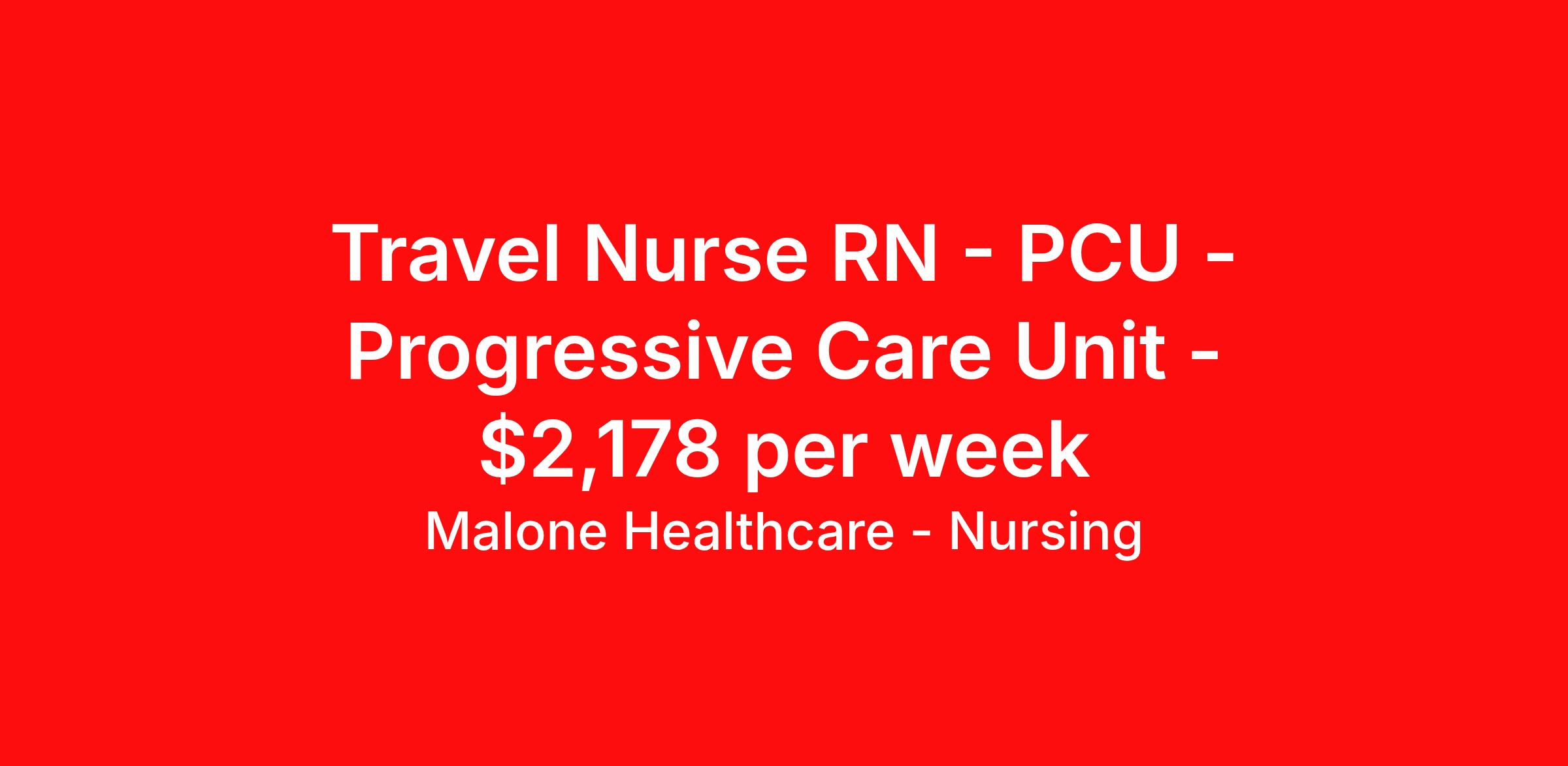 Malone Healthcare - Nursing is seeking a travel nurse RN PCU - Progressive Care Unit for a travel nursing job in Lexington, Kentucky. Job Description & Requirements Specialty: PCU - Progressive Care Unit Discipline: RN Start Date: 04/06/2026 Duration: 36 weeks 36 hours per week Shift: 12 hours, nights Employment Type: Travel About Malone Healthcare - Nursing With a commitment to providing a higher standard of service and experience in patient care, Malone Healthcare places expert nurses and allied health professionals in rewarding careers throughout the United States. As a leading healthcare staffing agency, Malone’s focus on compliance and integrity translates to a seamless experience for our team members and partner facilities. When you work with Malone Healthcare, you can rely on over 50 years of proven experience placing exceptional professionals in quality healthcare settings. Benefits Weekly pay Holiday Pay Guaranteed Hours Continuing Education 401k retirement plan Pet insurance Referral bonus Medical benefits Dental benefits Vision benefits License and certification reimbursement Life insurance
