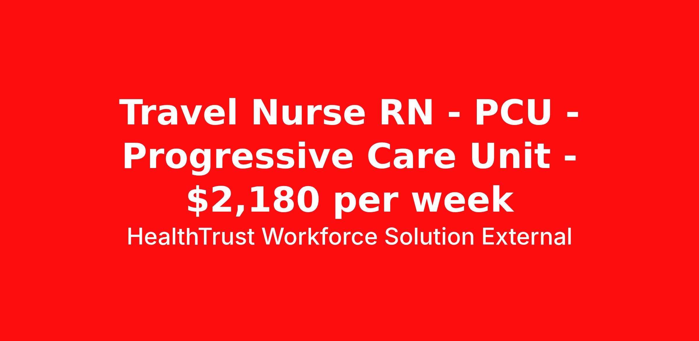 HealthTrust Workforce Solution External is seeking a travel nurse RN PCU - Progressive Care Unit for a travel nursing job in Birmingham, Alabama. Job Description & Requirements Specialty: PCU - Progressive Care Unit Discipline: RN Start Date: 04/20/2026 Duration: 13 weeks 36 hours per week Shift: 12 hours, nights Employment Type: Travel • Specialty: PCU - Cardiac • Shift: 18:30 - 07:00 • Weekly Guaranteed Hours: 36 • Weekend Hours: Every other weekend • Call Requirements: None • Required Certifications: AHA BLS and AHA ACLS • Years of Experience: 2 • Float Requirements: Occasional to like unit Unit Information: • Number of Beds: 41 • Patient Ratios: 4 – 5:1 • Equipment: Alaris pumps, Omnicell • EMR: EPIC Hiring Profile: • Must Have Skills/Experience: Telemetry, Cardiac drips • Preferred Skillset/Experience: • Type of Patients on Unit: Cardiac tele, post-CABG, post-Cath, Chest pain, CHF