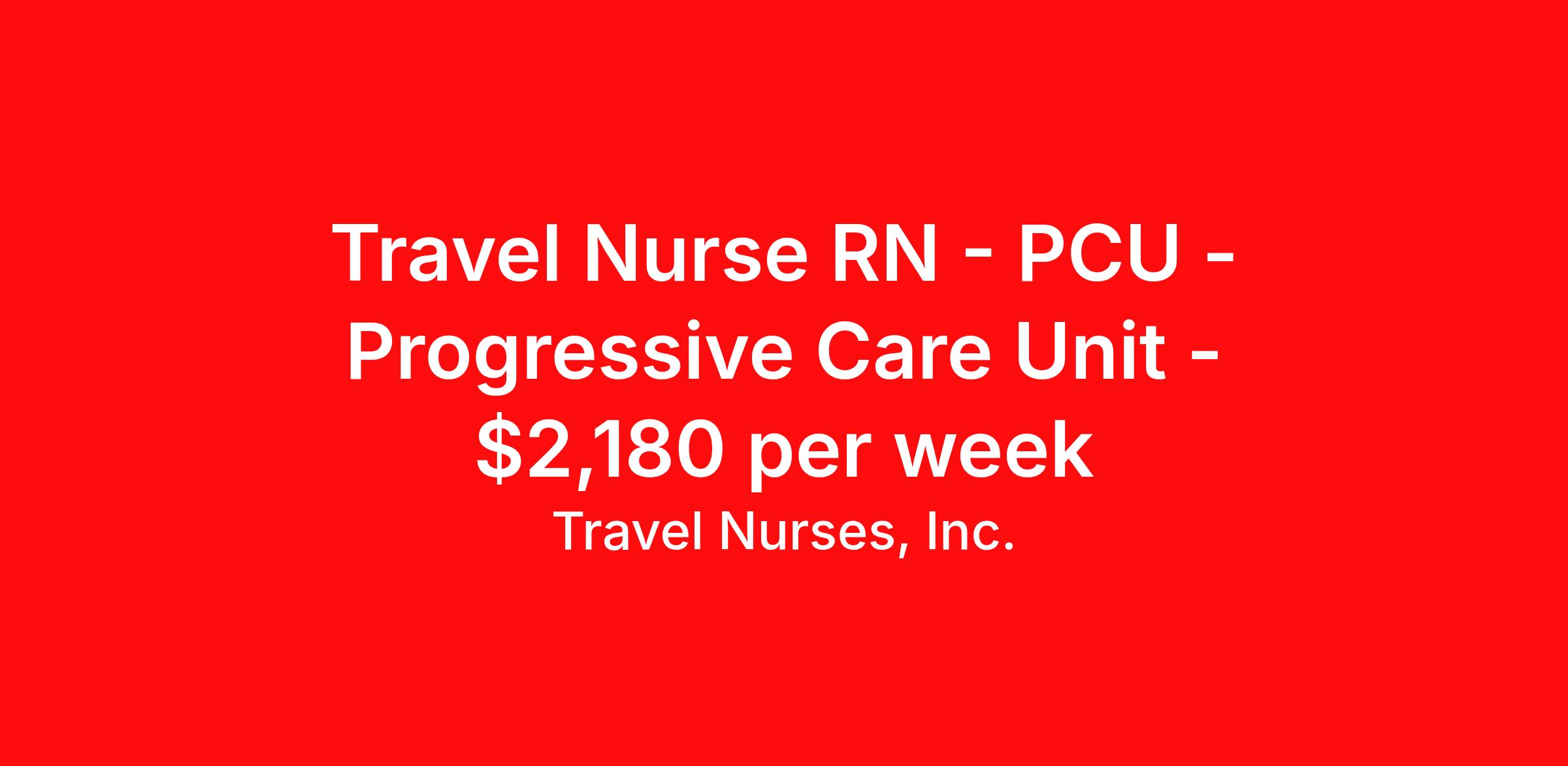 Travel Nurses, Inc. is seeking a travel nurse RN PCU - Progressive Care Unit for a travel nursing job in Flint, Michigan. Job Description & Requirements Specialty: PCU - Progressive Care Unit Discipline: RN Start Date: 04/14/2026 Duration: 13 weeks 36 hours per week Shift: 12 hours Employment Type: Travel Travel Nurses, Inc. Job ID 308740. Pay package is based on 12 hour shifts and 36 hours per week (subject to confirmation) with tax-free stipend amount to be determined. Posted job title: PCU Registered Nurse About Travel Nurses, Inc. Travel Nurses, Inc. is a leading healthcare staffing agency that provides healthcare professionals with opportunities to work across the country. Founded by nurses in 1988, TNI has more than 30 years of experience in the industry. The agency initially focused on staffing operating room settings in the MidSouth. However, this quickly evolved to encompass all nursing specialties and allied health fields nationwide. At the heart of our mission is a profound respect for nurses, whom we consider the cornerstone of healthcare. This acknowledgment extends beyond the nursing profession alone. Travel Nurses, Inc. now proudly embraces a wide array of healthcare professionals, recognizing their crucial roles in our collective mission. Travel Nurses, Inc. is dedicated to providing comprehensive support and opportunities that will help facilitate complete career mobility in the healthcare field. Our commitment to transparency ensures that all professionals, not just nurses, can confidently accept any assignment without financial uncertainties. We prioritize our professionals’ well-being with comprehensive benefits packages, including day-one healthcare coverage, competitive salaries, bonuses and incentives. This underscores our unwavering commitment to offering the best possible rewards and support for all the professionals we serve. Benefits Weekly pay Continuing Education 401k retirement plan Wellness and fitness programs Mileage reimbursement Referral bonus Employee assistance programs Medical benefits Dental benefits Vision benefits Benefits start day 1 License and certification reimbursement Life insurance Retention bonus