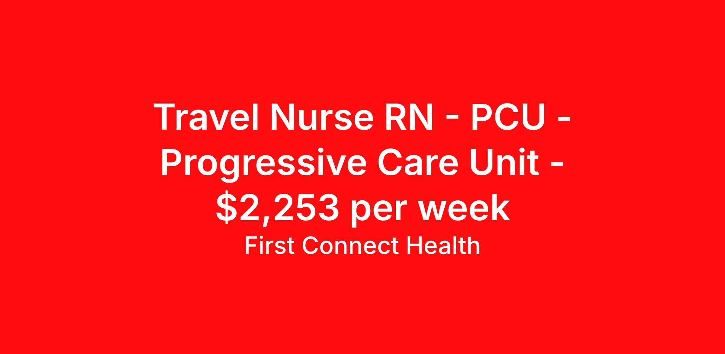 First Connect Health is seeking a travel nurse RN PCU - Progressive Care Unit for a travel nursing job in Fort Myers, Florida. Job Description & Requirements Specialty: PCU - Progressive Care Unit Discipline: RN Start Date: 04/03/2026 Duration: 13 weeks 36 hours per week Shift: 12 hours, nights, flexible Employment Type: Travel Position: RN – PCU ⏱ GH: 36 Location: Fort Myers, FL Gross Weekly: $2,253 W2 Rate: $20.00/hr Per-Diem: $1,533 ✅ Requirements: 2 years of PCU experience (ED experience not required ; no floating to ED) Certifications: BLS, ACLS, & NIHSS RN FL license or compact license required Interested candidates can apply for their next assignment. Health Park Medical Center-AN-0739 About First Connect Health At First Connect Health , we take pride in being a Joint Commission–certified healthcare staffing agency , headquartered in Newark, New Jersey. This prestigious certification is more than just a seal — it's a reflection of our commitment to excellence, safety, and quality in everything we do. By meeting the rigorous standards set by The Joint Commission, one of the most respected accrediting bodies in healthcare, we've demonstrated that our processes, compliance, and patient care standards are aligned with the highest levels of quality in the industry. But our dedication goes beyond certifications. Nurses choose First Connect Health because: ✅ Trust and Transparency: We foster honest communication, timely updates, and full transparency throughout your placement journey. ✅ Best Pay & Benefits: We offer industry-leading compensation packages, along with benefits that support your career goals. ✅ Flexibility & Choice: Whether you're seeking short-term assignments, long-term contracts, or local opportunities, we provide the flexibility to suit your preferences. ✅ Personalized Support: Our recruiters take the time to understand your needs, guiding you with care, respect, and responsiveness at every step. When you work with First Connect Health, you're not just another number — you're a valued professional. Join a team that’s focused on your success, your well-being, and your future in healthcare. Benefits Medical benefits Sick pay 401k retirement plan Weekly pay Referral bonus