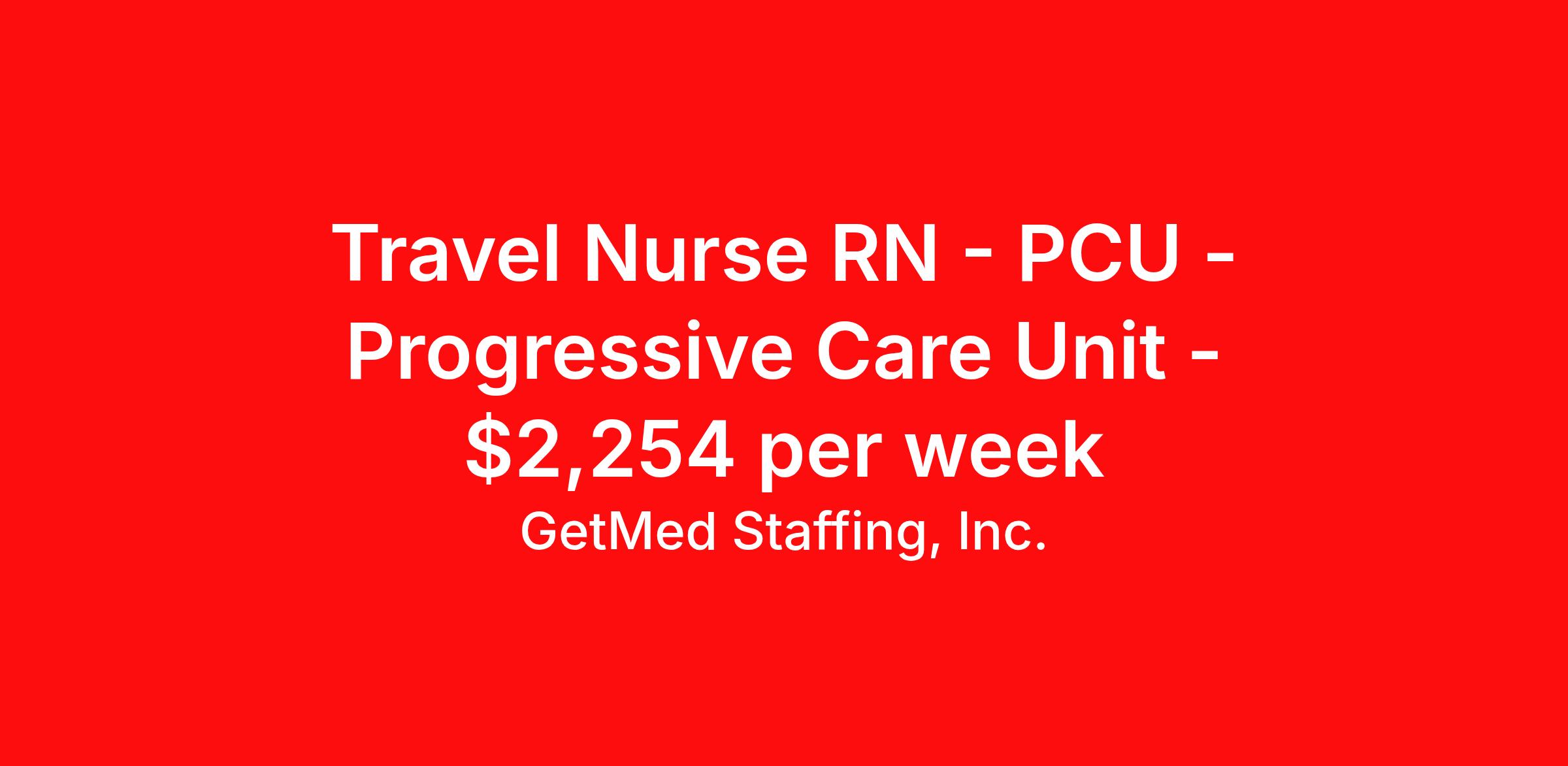 GetMed Staffing, Inc. is seeking a travel nurse RN PCU - Progressive Care Unit for a travel nursing job in Casper, Wyoming. Job Description & Requirements Specialty: PCU - Progressive Care Unit Discipline: RN Start Date: 04/13/2026 Duration: 13 weeks 36 hours per week Shift: 12 hours, nights Employment Type: Travel GetMed Staffing is searching for a strong PCU RN to assist our traveler-friendly client. A minimum of 1-2 years of experience is required. Traveling with GetMed Staffing offers the unique opportunity to gain diverse experiences, both personally and professionally. Gain experience that matters. GetMed Staffing, Inc. Job ID 36166088. Pay package is based on 12 hour shifts and 36.0 hours per week (subject to confirmation) with tax-free stipend amount to be determined. Posted job title: RN:PCU,19:00:00-07:00:00 About GetMed Staffing, Inc. We are a diversity owned company, specializing in healthcare recruiting services. We truly understand how important a healthcare travelers' relationship is with their recruiter, as well as our relationship is with our healthcare facilities. We recognize that the needs of our healthcare travelers can vary, and therefore we provide the personalized touch necessary to ensure a successful travel assignment each and every time. Our healthcare facilities and clients benefit from us putting our healthcare travelers first. GetMed Staffing is excited to be a leader within the industry by focusing on providing healthcare travelers with more choices and possibilities as they plan for their next healthcare travel assignment. Benefits Life insurance Medical benefits Dental benefits Vision benefits 401k retirement plan