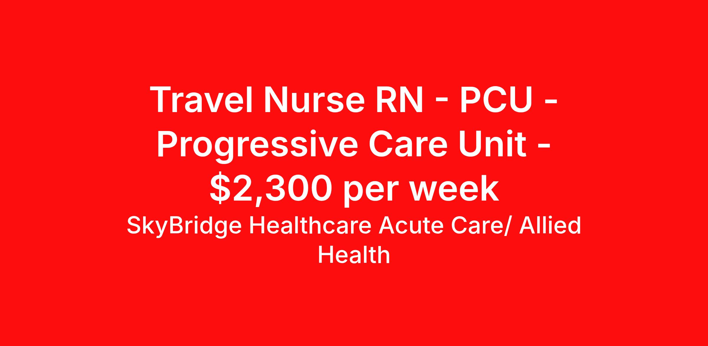 SkyBridge Healthcare Acute Care/ Allied Health is seeking a travel nurse RN PCU - Progressive Care Unit for a travel nursing job in Kearney, Nebraska. Job Description & Requirements Specialty: PCU - Progressive Care Unit Discipline: RN Duration: 13 weeks 36 hours per week Shift: 12 hours, days Employment Type: Travel SkyBridge Healthcare Acute Care/ Allied Health Job ID ML761926MS. Pay package is based on 12 hour shifts and 36 hours per week (subject to confirmation) with tax-free stipend amount to be determined. About SkyBridge Healthcare Acute Care/ Allied Health It is our mission at SkyBridge Healthcare to connect professionals within the healthcare community through both genuine relationships and quality work. We understand the demands of healthcare positions which is why we want to give back to Healthcare Professionals who give so much to their communities. We’re partnered with some of the greatest facilities in the nation, therefore we ensure our Healthcare Professionals will receive top-notch treatment every step of the way. Our specialties include Nursing, Allied Health, Laboratory, Therapy, Healthcare Information Technology, and Revenue Cycle. Follow us on social media to stay in the know of our latest company updates and job postings. Benefits Weekly pay Holiday Pay Guaranteed Hours Vision benefits 401k retirement plan License and certification reimbursement Mileage reimbursement Referral bonus Employee assistance programs Medical benefits Life insurance Dental benefits