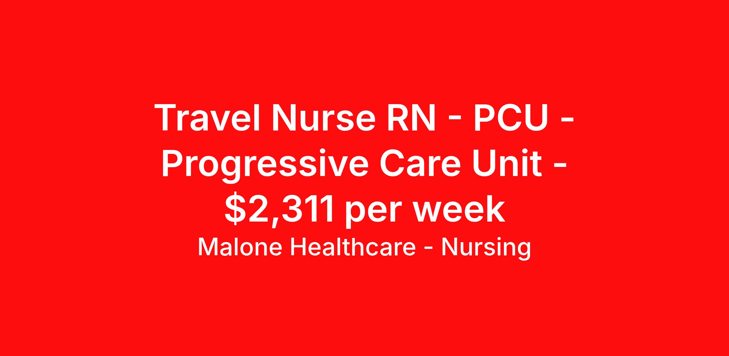 Malone Healthcare - Nursing is seeking a travel nurse RN PCU - Progressive Care Unit for a travel nursing job in Louisville, Kentucky. Job Description & Requirements Specialty: PCU - Progressive Care Unit Discipline: RN Start Date: 04/01/2026 Duration: 13 weeks 36 hours per week Shift: 12 hours, nights Employment Type: Travel About Malone Healthcare - Nursing With a commitment to providing a higher standard of service and experience in patient care, Malone Healthcare places expert nurses and allied health professionals in rewarding careers throughout the United States. As a leading healthcare staffing agency, Malone’s focus on compliance and integrity translates to a seamless experience for our team members and partner facilities. When you work with Malone Healthcare, you can rely on over 50 years of proven experience placing exceptional professionals in quality healthcare settings. Benefits Weekly pay Holiday Pay Guaranteed Hours Continuing Education 401k retirement plan Pet insurance Referral bonus Medical benefits Dental benefits Vision benefits License and certification reimbursement Life insurance
