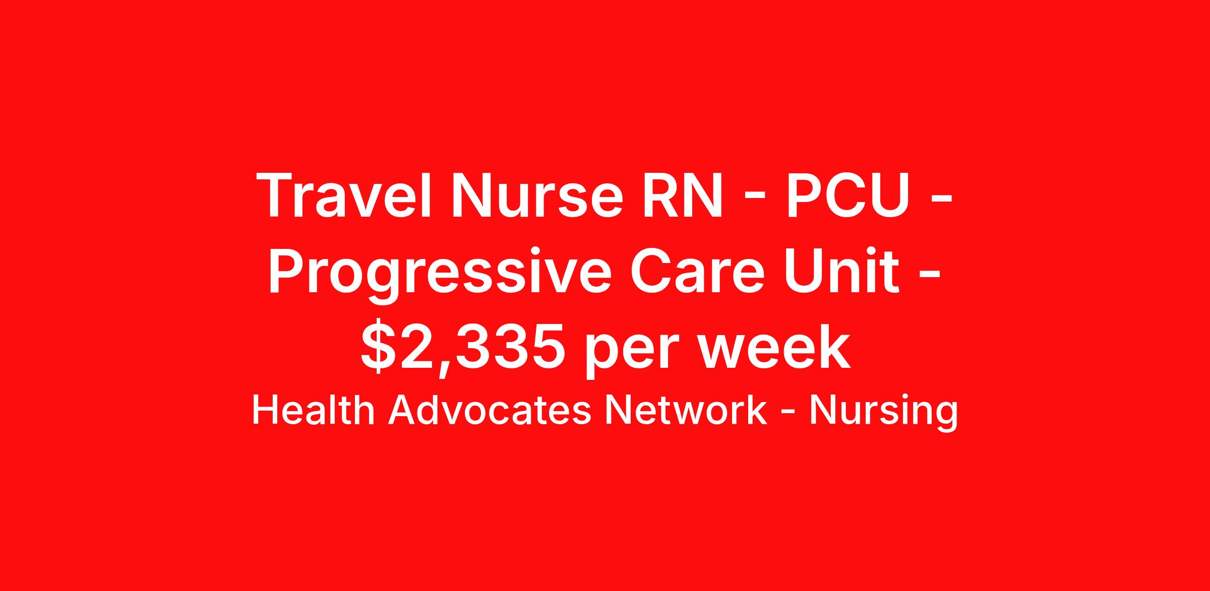 Health Advocates Network - Nursing is seeking a travel nurse RN PCU - Progressive Care Unit for a travel nursing job in Wheeling, West Virginia. Job Description & Requirements Specialty: PCU - Progressive Care Unit Discipline: RN Start Date: ASAP Duration: 12 weeks 36 hours per week Shift: 12 hours, rotating Employment Type: Travel RN – PCU Registered Nurse - Health Advocates Network is urgently hiring PCU RNs with at least 2 years of recent experience! IMMEDIATE STARTS! Travel package: $2,335.00 weekly Shift: 12- hour ROTATING DAY/NIGHT shifts available 13 -week contracts available Specialty: PCU Registered Nurse (RN) Radius Rule: 50-mile radius applies Requirements: Active WV or Compact Registered Nurse License (if applicable) Valid BLS Graduate of an Accredited School of Nursing Additional certifications may be required Benefits We Offer: Competitive pay rates, Referral Bonus, Medical, Dental, Vision, and 401k. Travel reimbursement and per diem allowances, Employee discounts, educational opportunities, and more! To apply for this job now or to find out more about other opportunities with Health Advocates Network, Inc., reply to this posting, contact us at , or call/text . We can provide you with unparalleled access to exciting career opportunities. Health Advocates Network, Inc . is an equal opportunity employer. All qualified applicants shall receive consideration for employment without regard to any legally protected basis protected by applicable federal or state law, except where a bona fide occupational qualification applies. Refer a qualified Allied Professional for a $1,000.00 bonus opportunity! HANStaff Job ID 479019. Pay package is based on 12 hour shifts and 36 hours per week (subject to confirmation) with tax-free stipend amount to be determined. Posted job title: RN - PCU About Health Advocates Network - Nursing Health Advocates Network was founded on the basis of a shared aspiration, to improve the way healthcare staffing is done. We are a company established and led by nurses. Our flexible approach enables us to develop solutions customized to your specific needs. From short- and long-term travel contracts to local and per diem assignments and more, we are here to get you to your next adventure! By solving challenges, providing the best placements, and advocating for you, we stand to help you thrive and pave the path forward in your career. Click on the videos below to learn more about our values!