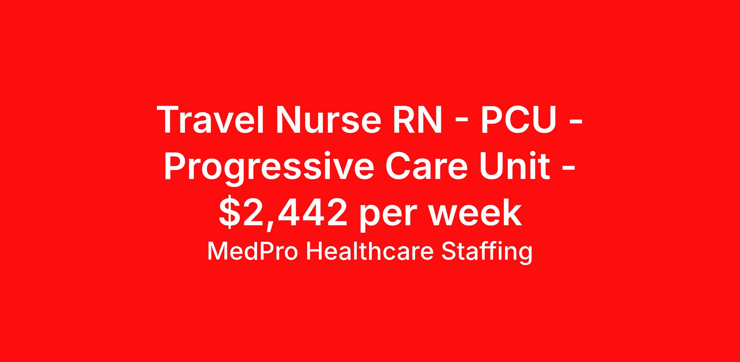 MedPro Healthcare Staffing is seeking a travel nurse RN PCU - Progressive Care Unit for a travel nursing job in Tucson, Arizona. Job Description & Requirements Specialty: PCU - Progressive Care Unit Discipline: RN Start Date: 04/13/2026 Duration: 13 weeks 36 hours per week Shift: 12 hours, nights Employment Type: Travel MedPro Healthcare Staffing , a Joint Commission-certified staffing agency, is seeking a quality PCU/Step-down Nurse for a travel assignment with one of our top healthcare clients. Requirements Active RN License Degree from accredited nursing program BLS & ACLS Certifications Eighteen months of recent experience in an Acute Care PCU/Step-down setting Other requirements to be determined by our client facility Benefits Weekly pay and direct deposit Full coverage of all credentialing fees Private housing or housing allowance Group Health insurance for you and your family Company-paid life and disability insurance Travel reimbursement 401(k) matching Unlimited Referral Bonuses up to $1,000 Duties Responsibilities Progressive Care Nurses (PCU) care for patients requiring close monitoring and frequent assessment, but who aren't unstable enough to need ICU care. PCU nurses monitor cardiac and other critical vital signs and detect any changes, thereby enabling intervention of life-threatening or emergency situations. Many PCU patients receive complex medications that may require titration based on the patient’s vital signs The PCU nurse is sometimes also called a step-down nurse and the PCU is also known as cardiac step-down, medical step-down, neuro step-down, surgical step-down and ER holding. Monitor and assess patients who aren't unstable enough to need ICU care. Utilize computer equipment to monitor cardiac and other vital information and detect any changes, thereby enabling intervention of life-threatening or emergency situations. About Agency MedPro Healthcare Staffing is a Joint Commission certified provider of contract staffing services. Since 1983, we have placed nursing and allied travelers in top healthcare facilities nationwide. Join us today for your very own MedPro Experience®. If qualified and interested, please call for immediate consideration. MedPro Staffing is an Equal Opportunity Employer. All applicants will be considered for employment without attention to race, color, religion, national origin, age, sex, disability, marital status or veteran status. Key Words: PCU Nurse, RN-Progressive Care, Telemetry Nursing positions, Step-down, Stepdown, Travel Nurse, Contract Nurse, Agency Nurse, EKG, Tele, Telemetry Contracts, Registered Nurse, Telemetry Nurse, Tele Nurse, RN, Registered Nurse, Telemetry Nurse, RN-Tele, Travel Nursing *Weekly payment estimates are intended for informational purposes only and include a gross estimate of hourly wages and reimbursements for meal, incidental, and housing expenses. Your recruiter will confirm your eligibility and provide additional details. MedPro Job ID a0Fcx00000HMXefEAH. Pay package is based on 12 hour shifts and 36 hours per week (subject to confirmation) with tax-free stipend amount to be determined. Posted job title: PCU/Step-down Nurse Nursing: PCU. About MedPro Healthcare Staffing At MedPro Healthcare Staffing , we believe no one cares more for caregivers than we do. Our mission is simple: you focus on your patients, and we’ll take care of the rest. As a Joint Commission-certified leader in temporary and contract healthcare staffing since 1983, MedPro has proudly connected nursing and allied travelers with top healthcare facilities across the nation. With thousands of job opportunities available nationwide, we make it easy to find assignments that align with your goals and lifestyle. Our on-staff clinical support team—alongside a compassionate group of experienced recruiters—provides hands-on guidance every step of the way. From Day 1 medical benefits and a 401(k) plan to personalized career support, we’re committed to ensuring every professional we serve feels valued, cared for, and empowered to succeed. Guided by a CEO who is a Registered Nurse, MedPro is built on a foundation of clinical insight and genuine compassion for the caregiving community. Through The MedPro Experience® , we deliver travel assignments that are rewarding, memorable, and designed to help you DREAM big, EXPLORE often, and ACHIEVE greatness. Benefits Day 1 medical, dental, and vision benefits for you and your family Weekly pay and direct deposit Unlimited Referral Bonuses starting at $500 On Staff Clinical Support Team Access to nationwide travel assignments MPX Mobile app -24/7 real-time access to jobs, credentials, assignment details, and more Full coverage of all credentialing fees Private housing or housing allowance Tax Free Per Diems, Housing Stipends and Travel Reimbursements Company-paid life and disability insurance Travel reimbursement 401(k) matching Benefits Weekly pay Referral bonus Employee assistance programs