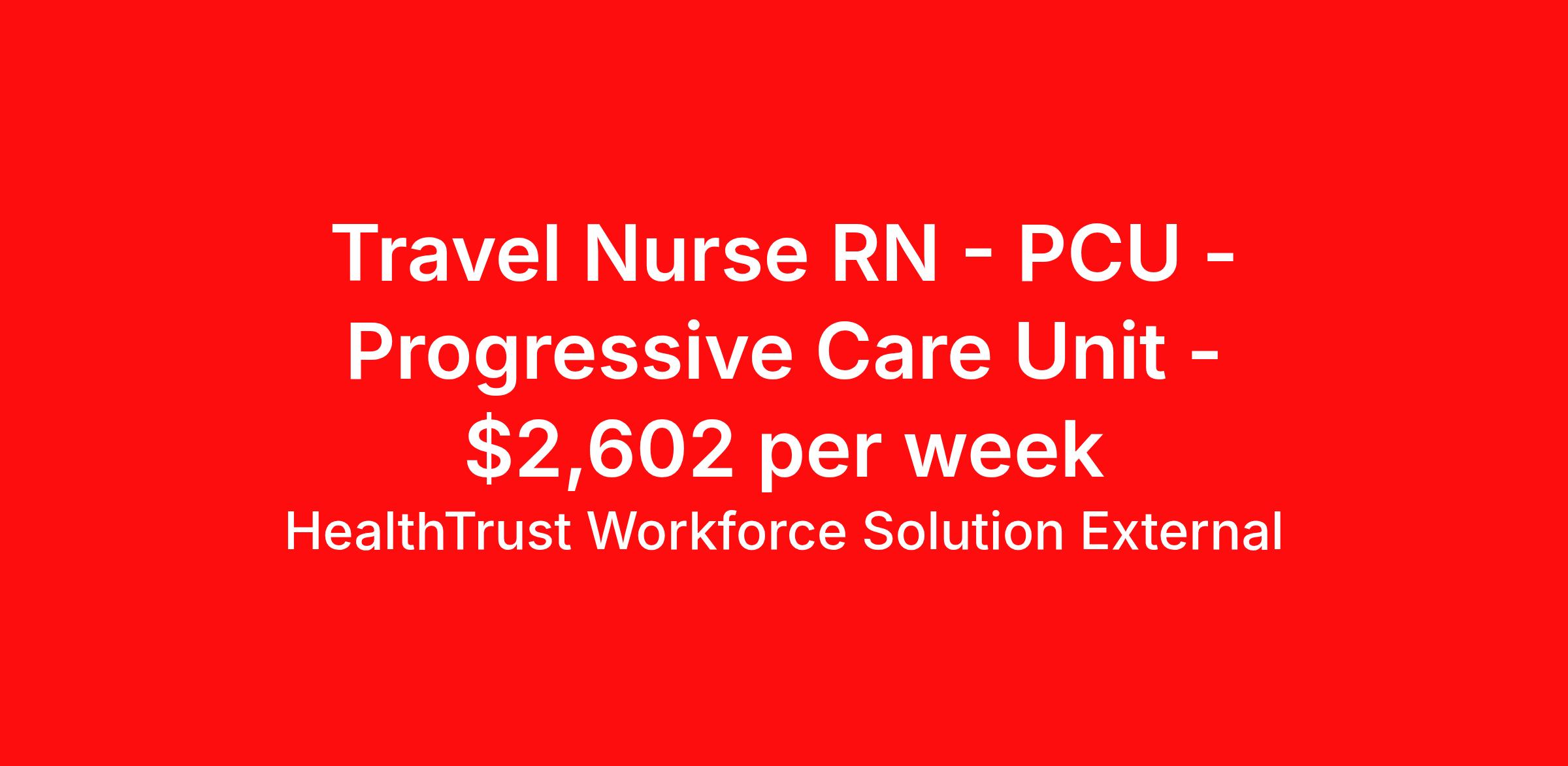 HealthTrust Workforce Solution External is seeking a travel nurse RN PCU - Progressive Care Unit for a travel nursing job in Reno, Nevada. Job Description & Requirements Specialty: PCU - Progressive Care Unit Discipline: RN Start Date: 04/20/2026 Duration: 13 weeks 36 hours per week Shift: 12 hours, days Employment Type: Travel Gross Weekly: $ 2,602.17 | Hourly: $29.90 | Weekly Stipends: $ 1,525.77 ⌚ Shift: 3x12 Days (645a - 715p) Requirements & Experience: 2 Years Experience BLS - ACLS (AHA) NIHSS Must Be 50 Miles From The Facility